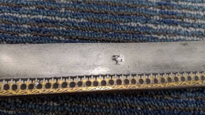 And I'm not sure. Many things are within the realm of possibility! The sword was likely commissioned during Aurangzeb's reign. At least one of Aurangzeb’s swords was stamped Andrea Ferara and most, if not all had European blades (one was likely sold yesterday at Christie's; they haven't posted results yet). If the person who commissioned my sword was a clever courtier, they probably would have wanted a European blade or at least something that looked very European. The blade could be wholly non-European or the marks could be from a local smith engraving European looking marks into a European blade. Or the marks could be a combination of European and other engraving. Or just random embellishment by a clever Portuguese trader before shipping it to India. None of the above possibilities cause me to value it less. I just want to learn more about it. It is that backwards 'y' that causes me to wonder. Or maybe it's a 'V' stamped on top of an 'O'? There's also the "CW" or "CVV" which is an odd combination in many languages. |