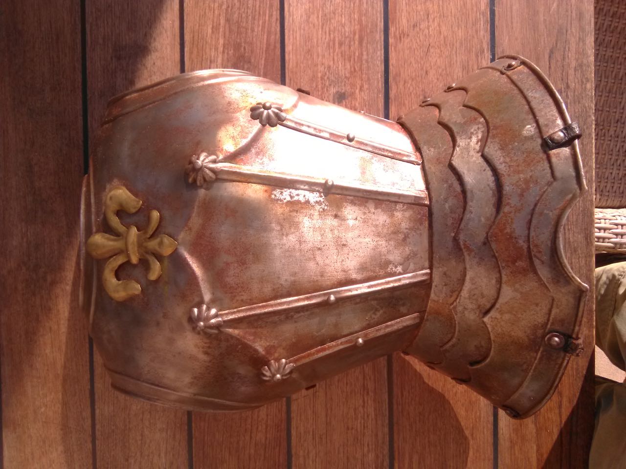I bought this ''theater'' breasplate, the man who sold it used it for his 10 years'old son for a carnaval knight costume... Some parts ( the fleur de lys...) seems just a ''cheap'' ''recent'' replica but the ties seems quite old ( 19th century ? ), breast and back are well made and there is a stamp. ( I don't think they did that for theatre use ...) Have you an idea about age of this kind of replicas ? Thank's in advance |