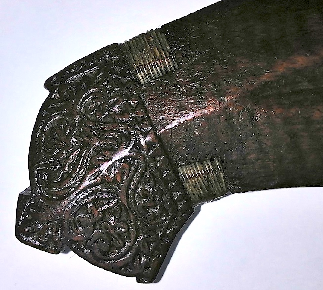The scabbard is Palawano. I have checked some aspects of the carving at the throat and it is certainly Palawano. A further picture is attached of this area. There are horizontal linear elements of triangle and diamond shapes (black arrows) intersected by similar vertical lines (white arrows) that segment the carvings into squares containing similarly carved motifs. Above that are further carved vines and leaves, but if one looks closely the carving is asymmetrical. The segmented elements are typical Palawano work, as shown by the second attached picture which is from a Palawano bangkung scabbard. My sword and scabbard are of mid-late 20th C. manufacture and the carving is not as detailed as on your barung scabbard. The asymmetric areas on the barung scabbard are not typical of Sulu carvings, so I don't think this scabbard started out as Sulu. Yakan carvings can be asymmetrical, as can those from Zamboanga. However, given the other features that I described earlier that clearly point to Palawano work, I think we can say that the entire scabbard is Palawano work. As I mentioned previously, I am confident the blade is Sulu (most likely Tausug) in origin and made by a Chinese smith. There are numerous examples of such blades, some of which appear to be from the 19th C. or even earlier. The pommel is made from banati wood, with its typical "striped" appearance. This is a common and prestigious wood used for pommels on Sulu barung, and I have not seen it used on Palawano weapons. The carved kakatua hilt also strikes me as Sulu, probably Tausug, although there may have been some recarving of the beak and crest--hard to say. The punto looks typical Sulu work: silver or silver wash over brass, uniform width, and simple circumferential line decoration. Many Palawano ferrules are brass and have a fluted "bell" shape at either or both ends. There appears to be a plaited silver wire ring at the end of the punto, again a common finding on higher quality Sulu barung. Plaited rings on Palawano hilts tend to be hemp or rattan, although I imagine silver could be anticipated also on higher quality pieces. So, I come back to my original thoughts--a Sulu (Tausug) barung in a Palawano scabbard. The barung is a higher end piece, datu quality perhaps, and the blade may be 100 years or so old. It's small size may mean it was a child's or woman's barung, or perhaps made for concealment. Thanks for showing this interesting piece. Ian. |