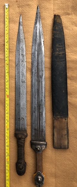 I have these two Kindjals and am wondering if anyone can tell me more about them. Not sure if there is anything that could provide a positive identification on these but ... The smaller one has Sun symbols stamped on the blade and is 20" in total length and maximum blade width is a little over 1 3/8". The larger one has neillo silver mounts and worn foliate patterns on both sides of the blade. It is 22.5" total length and 1 3/4" maximum blade width. Any help would be appreciated. Best Regards Rob |