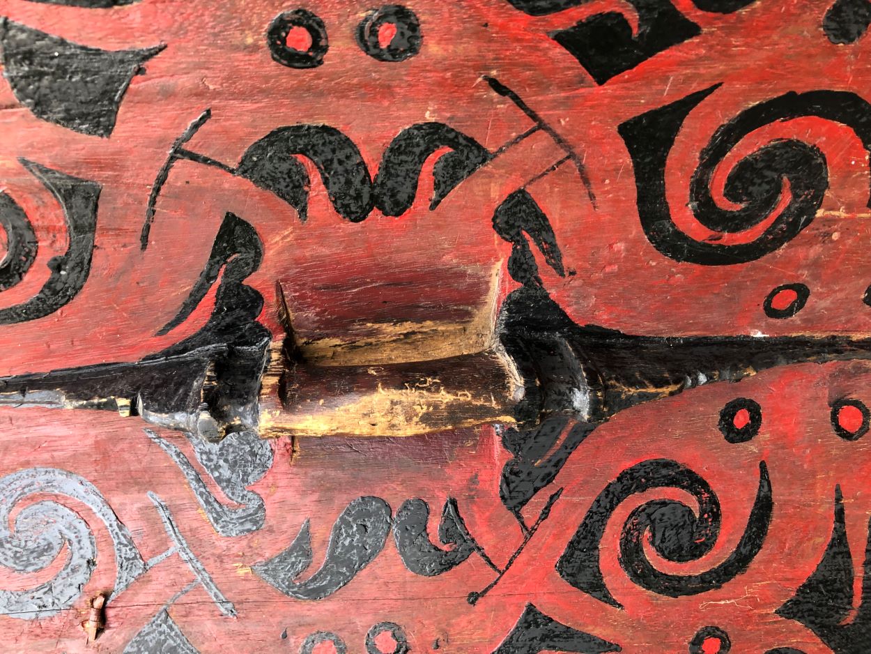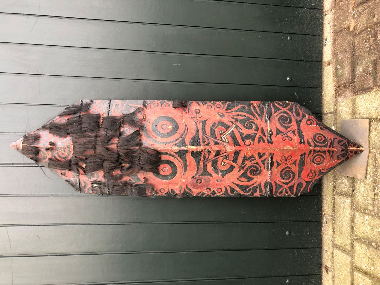Ancient "Klebit Bok" Dayak shield (hair shield). It has suffered through time and it is possible that the paint has been touched up in places. Despite that, it is a beautiful shield that is rarely offered. Dimensions 129cm x 39cm. Before I put it up for auction, I want to give potential enthusiasts a chance here. Price 1000 euros ex shipping. |