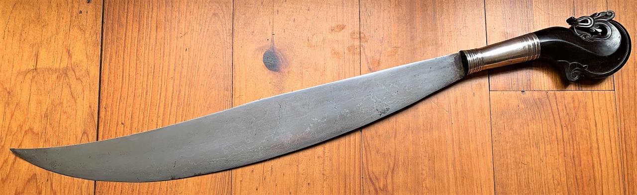 For collectors of Moro blades and other blades from the Philippines, the Baltimore show was a "bonanza!" There was a large quantity of Filipino blades there, and some supremely RARE ones. I was fortunate enough to get one of the very rare ones, and one that was a previous part of Dave Schmiedt's renowned collection. I am sure this sword had a name among the Moros, but I am not sure what that name was. It is not a barung; it's too light, and the spine of the blade does not have the consistent curve of a barung. The wooden hilt is beautifully carved in a naga, or serpent, motif with silver eyes and inserts down its spine. The ferrule is like one typically seen on a barung. This sword is the same sword shown in Robert Cato's book, MORO SWORDS (Singapore, 1996). the sword had no scabbard, but I would have to imagine that it originally had a scabbard similar to a barung, with its ferrule neatly fitting into the center of the mouth of the scabbard. Overall length: 25in./63.5cm/ Blade length: 18.25in./46.36cm/ Blade's widest point: 2.5in./6.4cm