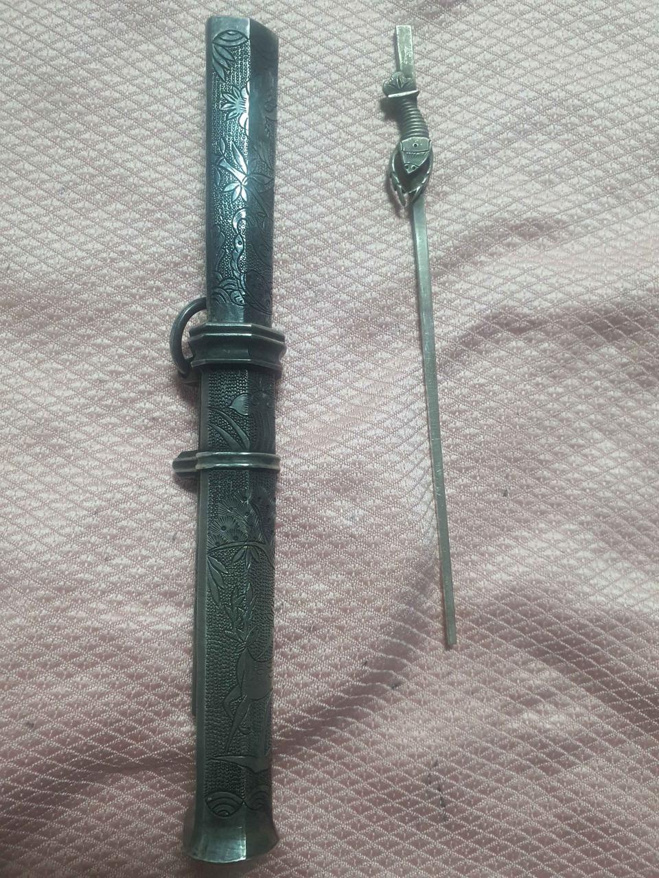 A recent acquisition is this later Joseon Period Eunjangdo. The overall length is 6 1/2 inches (16.5 cms). The knife itself is 5 1/4 inches long (13.5 cms) with a blade of 2 3/4 inches (7 cms). Overall it is silver with a weight just over 3 1/2 ounces (100 grams). These are known as higher class ladies 'jewellery' accessories for self defence. These appear to be very uncommon with little on the net so I got in touch with Mr Lee of Swords of Korea who confirmed the above assertions. You will notice that the chopsticks are bent. According to Mr Lee originally the chopsticks would have been straight and that possibly the owner bent them to form a more secure grip for the knife in the sheath. Because it is a friction fit it would obviously slacken off with use. From handling the knife I would definitely say this is without doubt a very reasonable conclusion. On mine the chopsticks fit snugly, smoothly and neatly into the sheath and when inserted the knife also fits snugly and the whole can be inverted and shaken without the knife falling out. I did find some photos of other Eunjangdo which would seem to confirm this. The photo on the right of the next post and the one on the bottom left both show indications of bent chopsticks. The chopsticks are both bent evenly as is mine which to me shows a deliberate act and not random 'wear and tear'. If anyone has more info on these unusual survivors please let me know. Regards, Norman. Last edited by Norman McCormick; 15th July 2024 at 01:36 PM. |