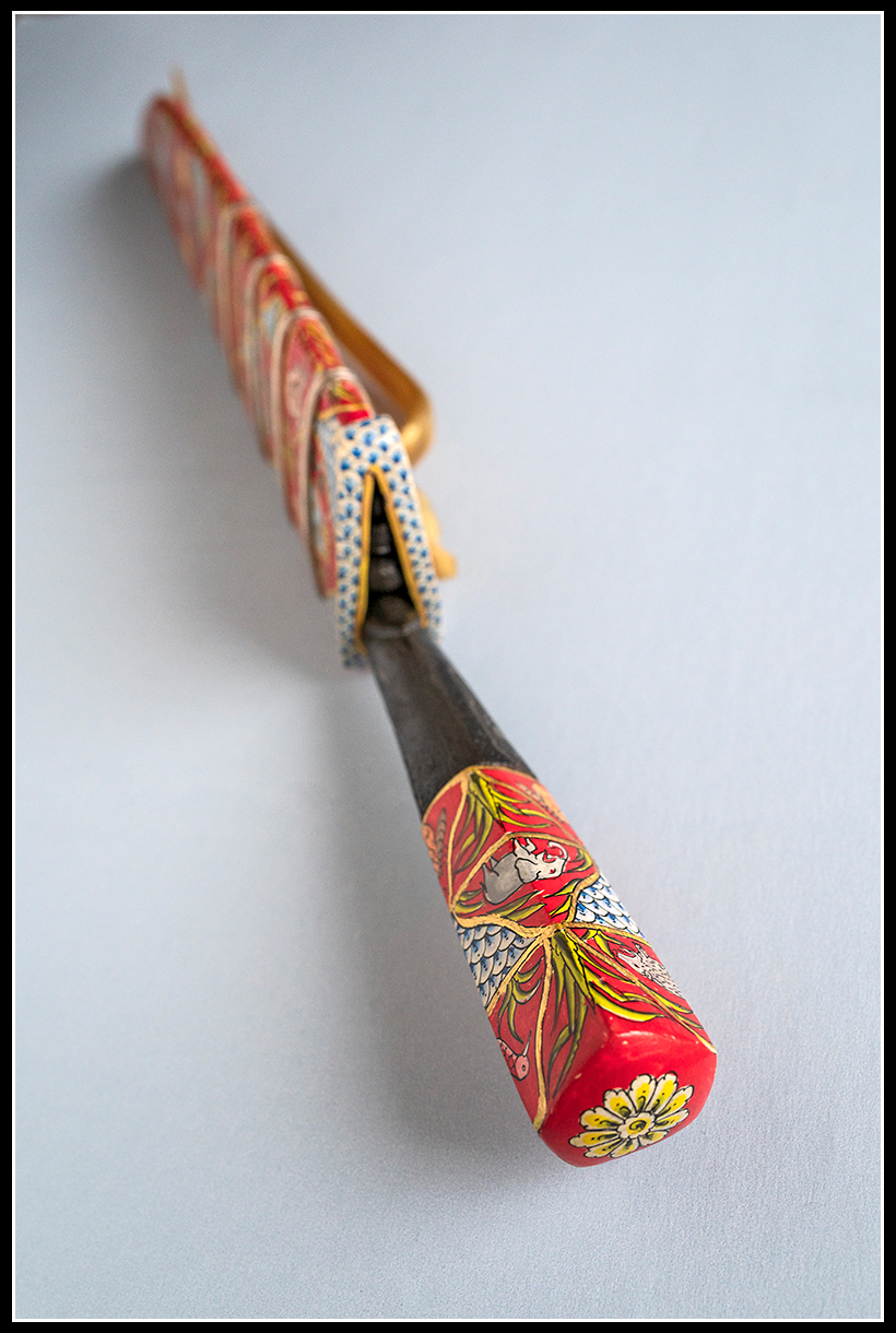 I think it had pamor at some time but is now not in stain. David do you have any reasoning to date it as you have as I have not found any guidance. I don't necessarily think that pamor in itself is a 100% guarantee of age or the fact of it being a high ranking piece though as that can easily be replicated in a modern setting. In fact I have seen a few of these pamored ones that look decidely recent. |