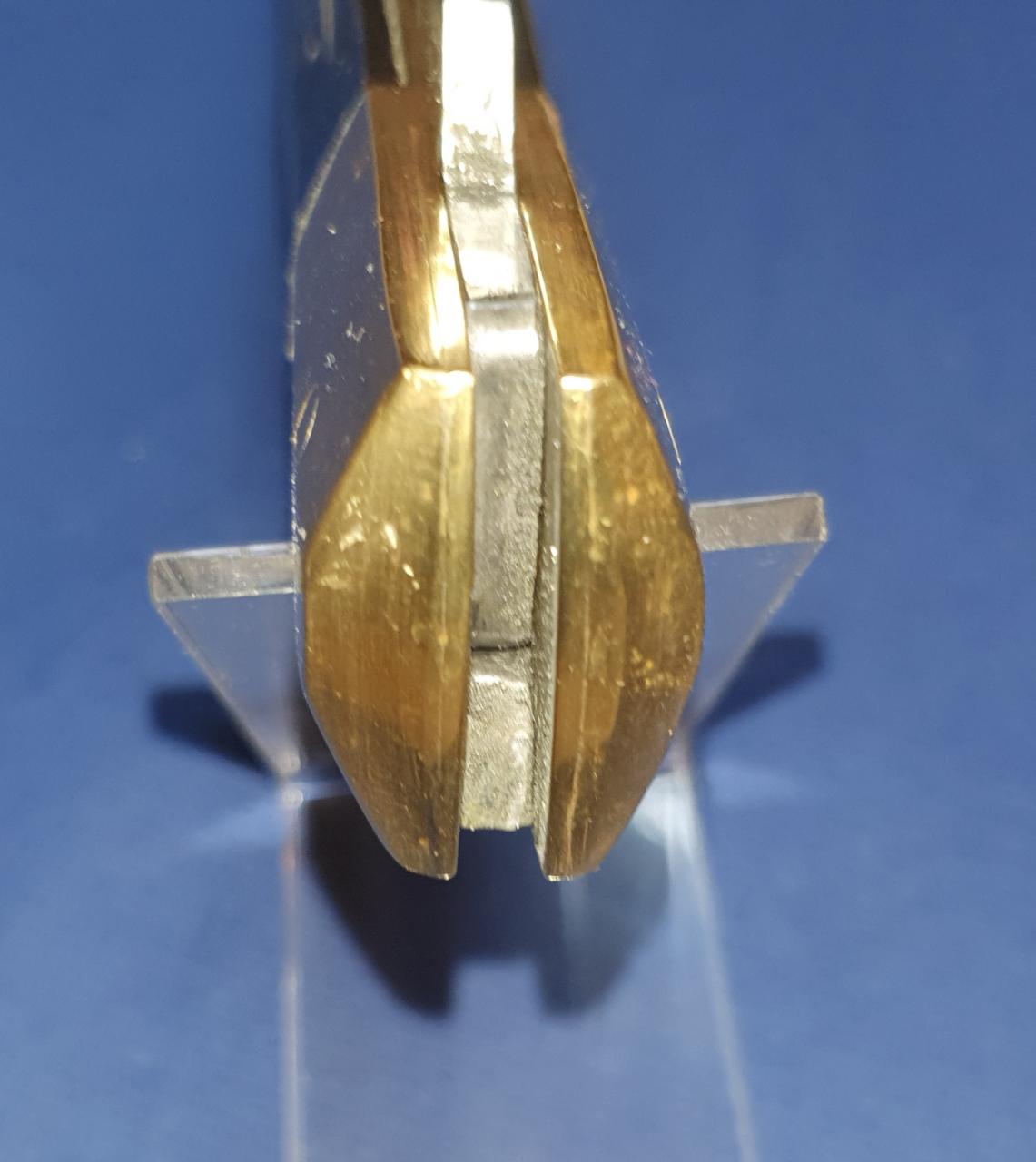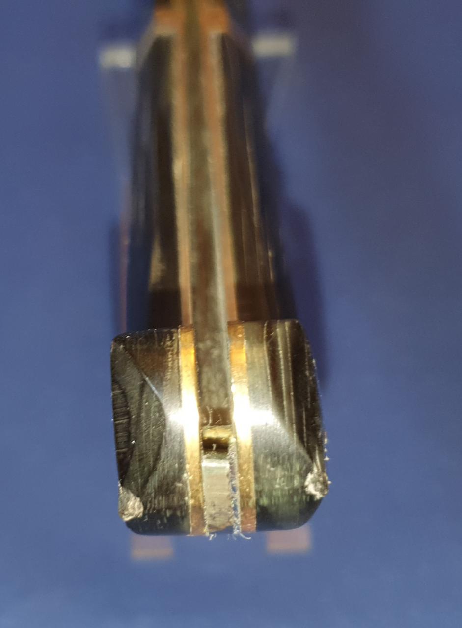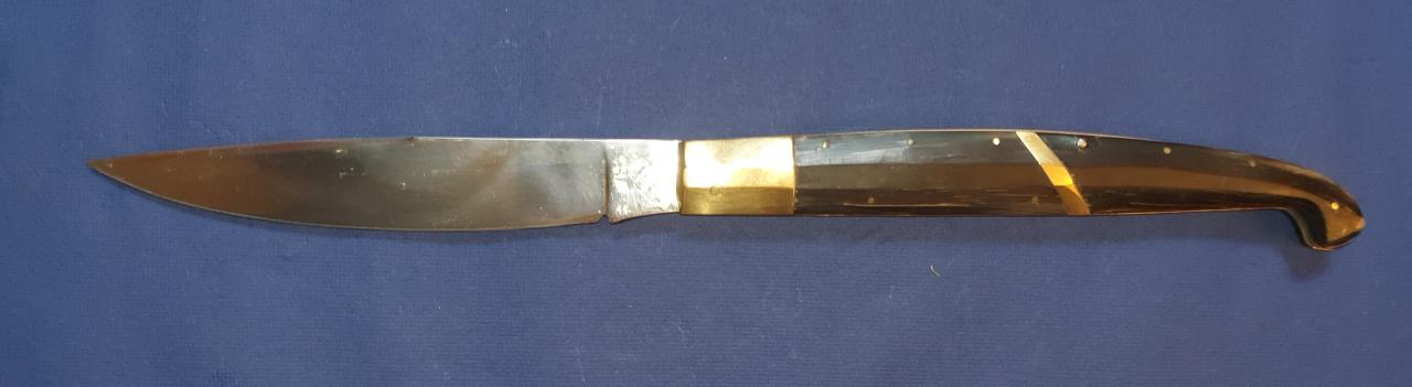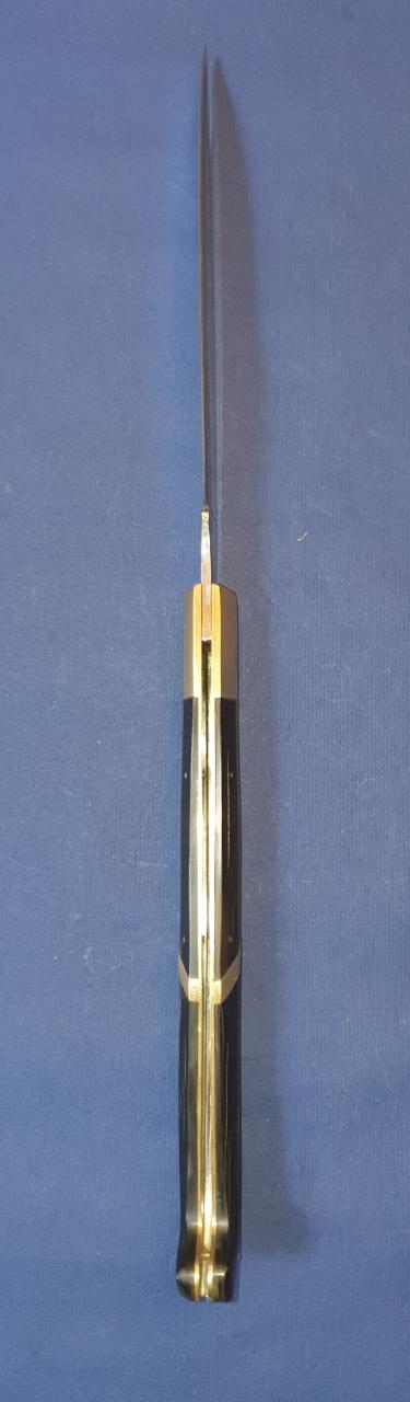 There are scratches and dents especially to one of the brass bolsters and seemingly a repair/restoration to one of the presumably muflon horn handle scales. The blade which is very sharp shows sharpening traces at the edge. There are also fine crevices at the horn scales. Over 50 cm opened, blade 23 cm, a little bit under 27 cm closed. 572 gram. Asking price is 250,- Euro plus shipping. Contact me by email: deuterdetlef@gmail.com |