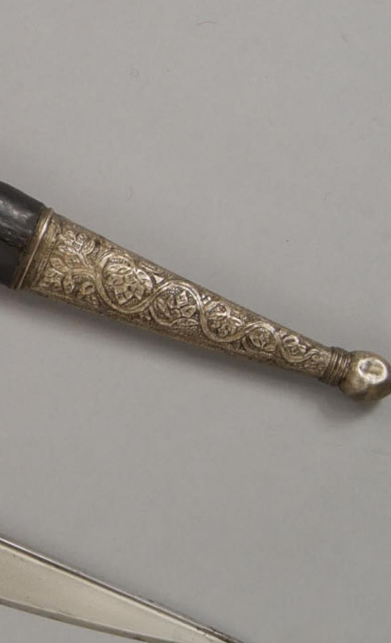 This khyber knife which has a handle wrapped in chased silver was labeled as Indian, but faceted bolsters are commonly found on Afghan khyber knives, and the chased motif resembles motifs found on Afghan silver chapes. That why I believe it’s Afghan but I’d like some input
