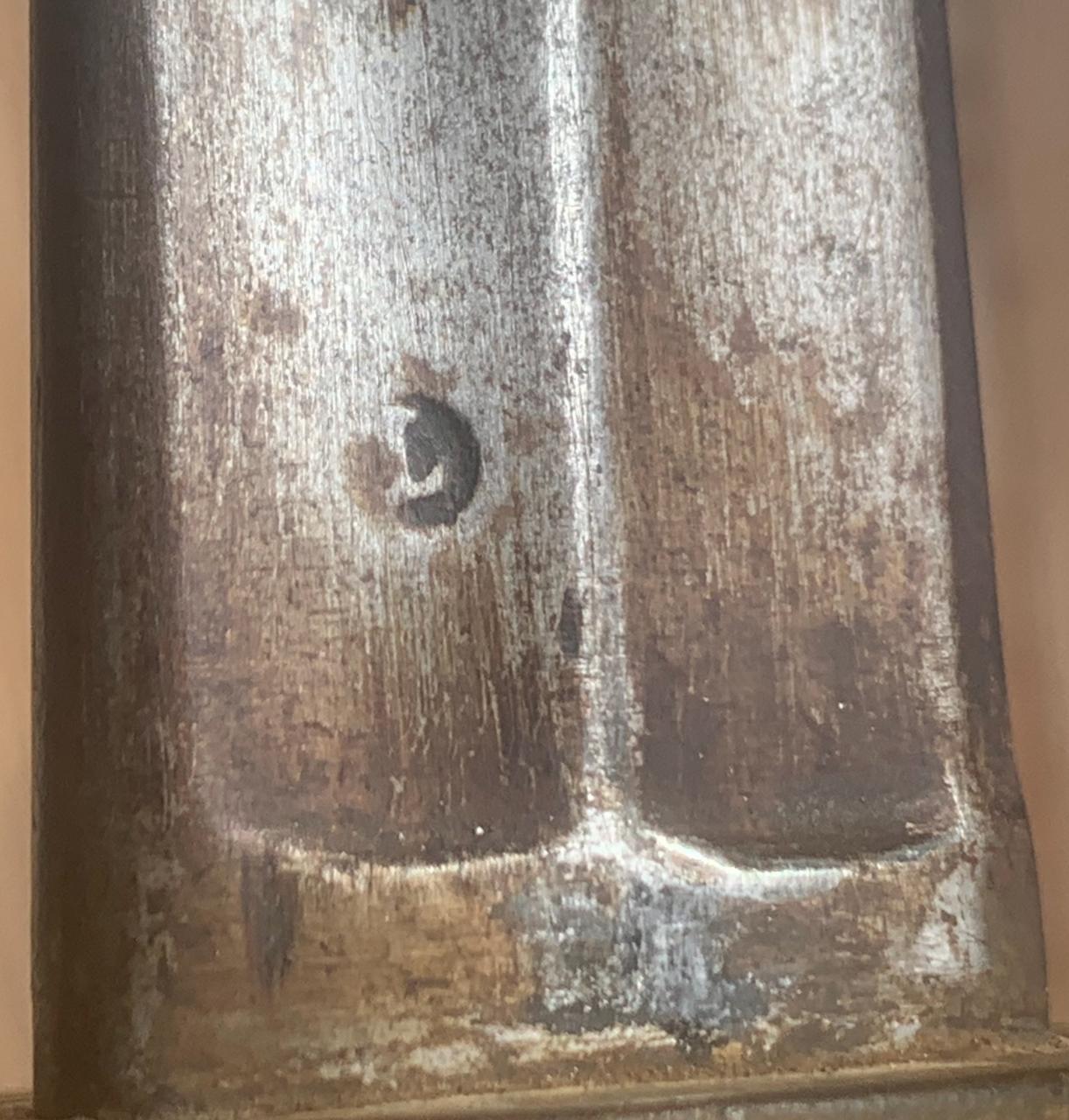 It has a later scabbard to match the shortened blade now at 35 1/2". The scabbard is plated and has only one ring band and is correct for the current blade length. As I understand these 1816p were modified for use by the Germans for Ulhan regts. Any additional information would be appreciated. |