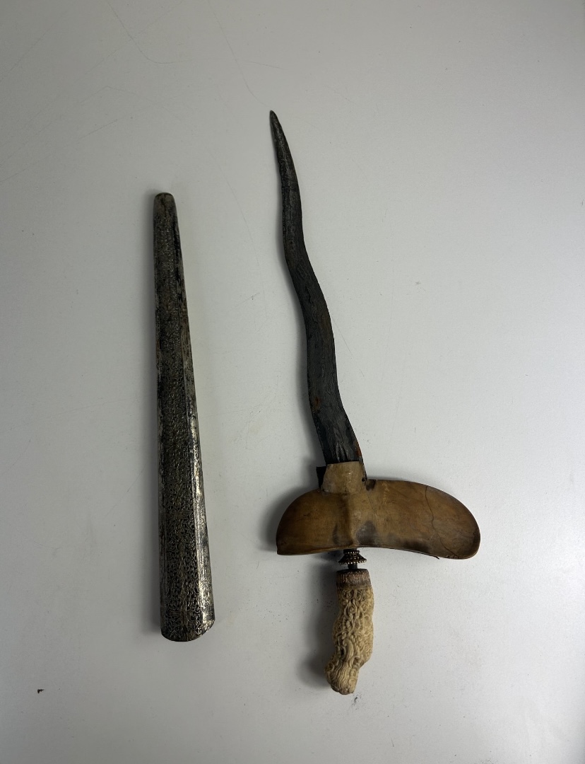 Here, this hilt has been mated to a Jogjakarta wrongko (scabbard), so it has probably been mated thus by a collector, rather than a user in place of origin.