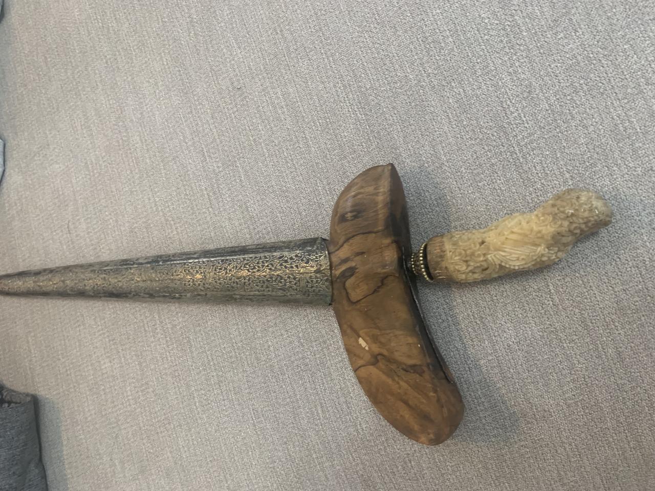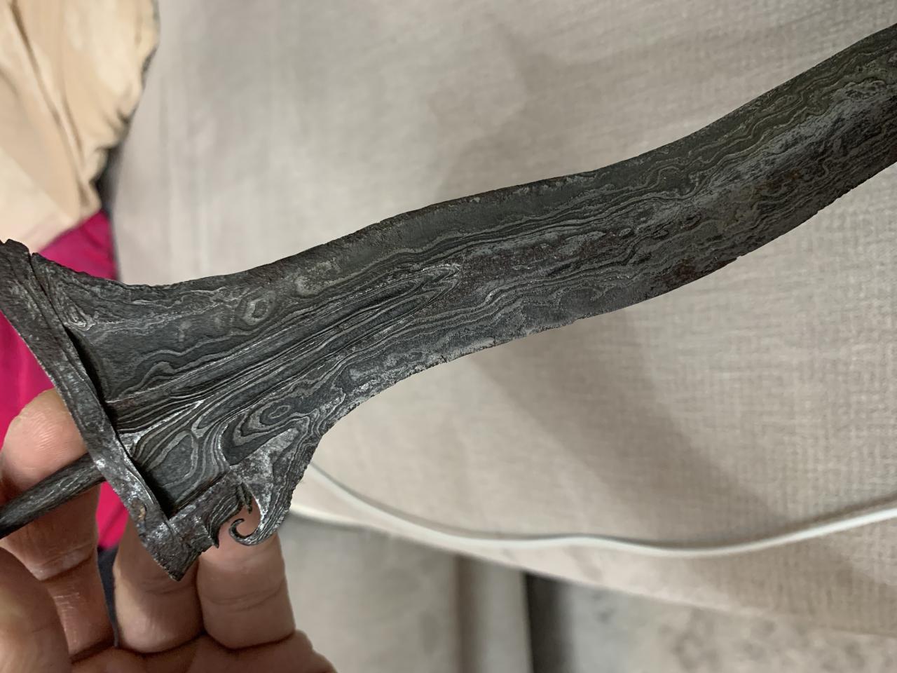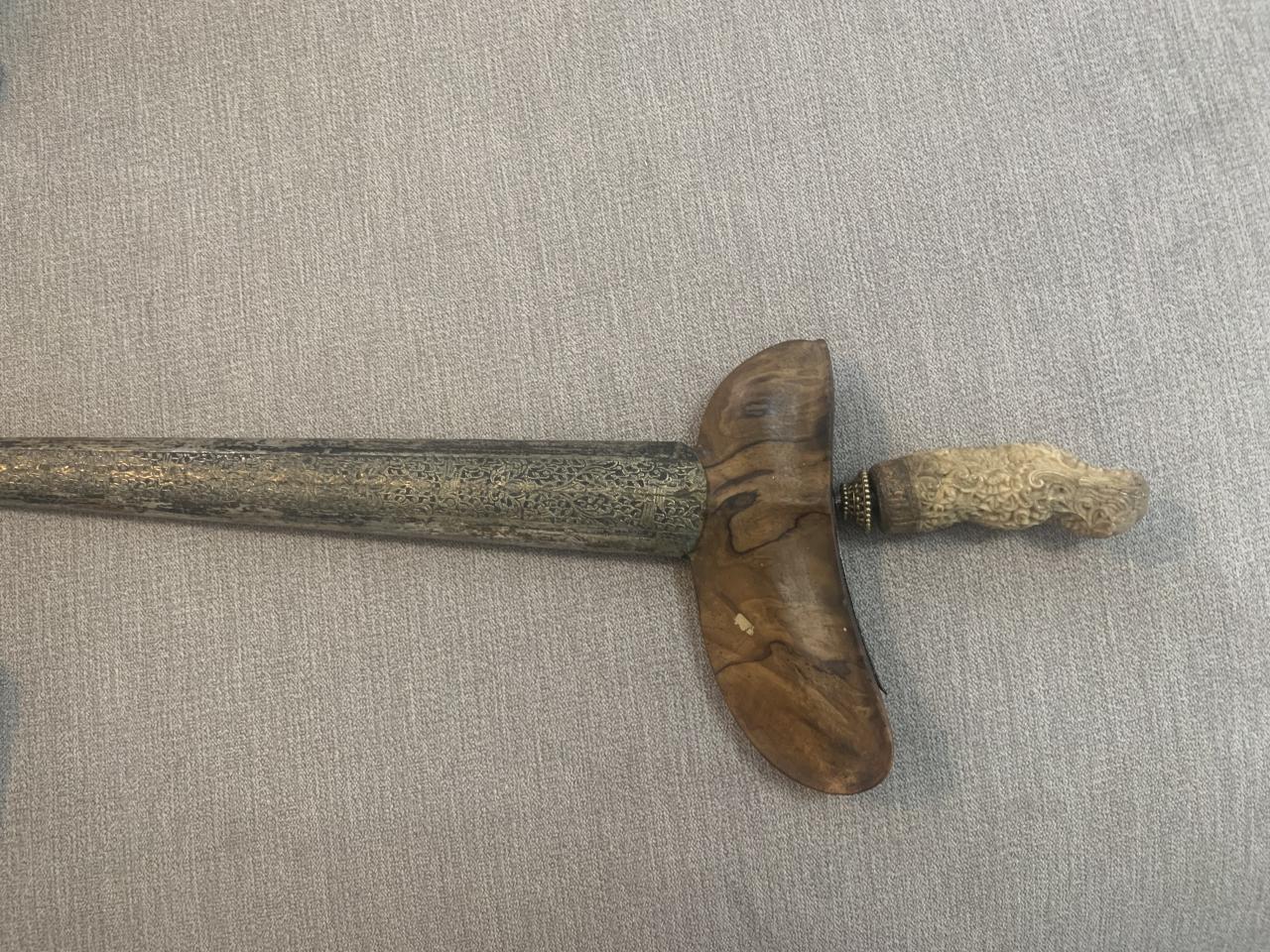 A little rusty, the wood is cracked, the other part of the wood is in the scabbard. Does anyone know anything more ,how old can it be ?