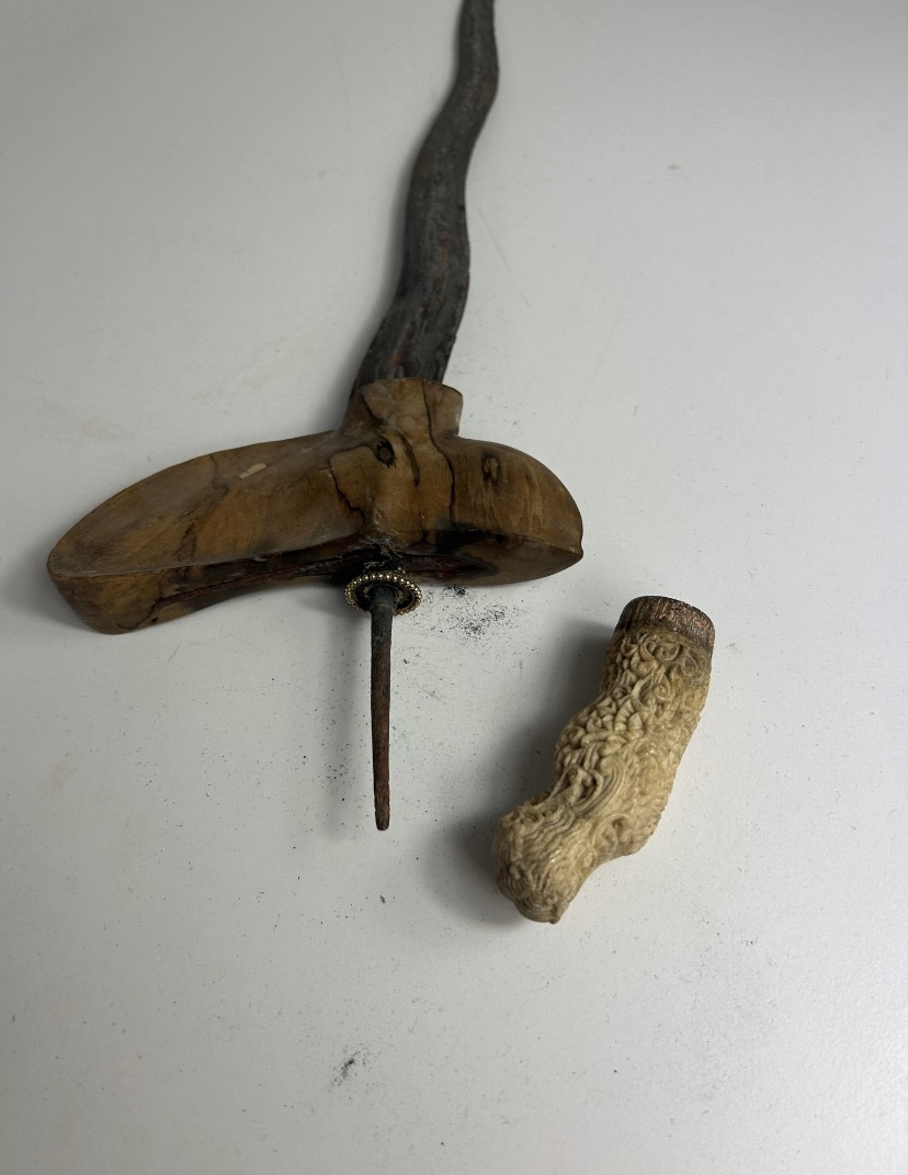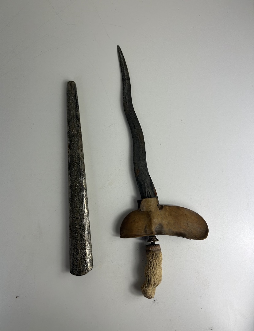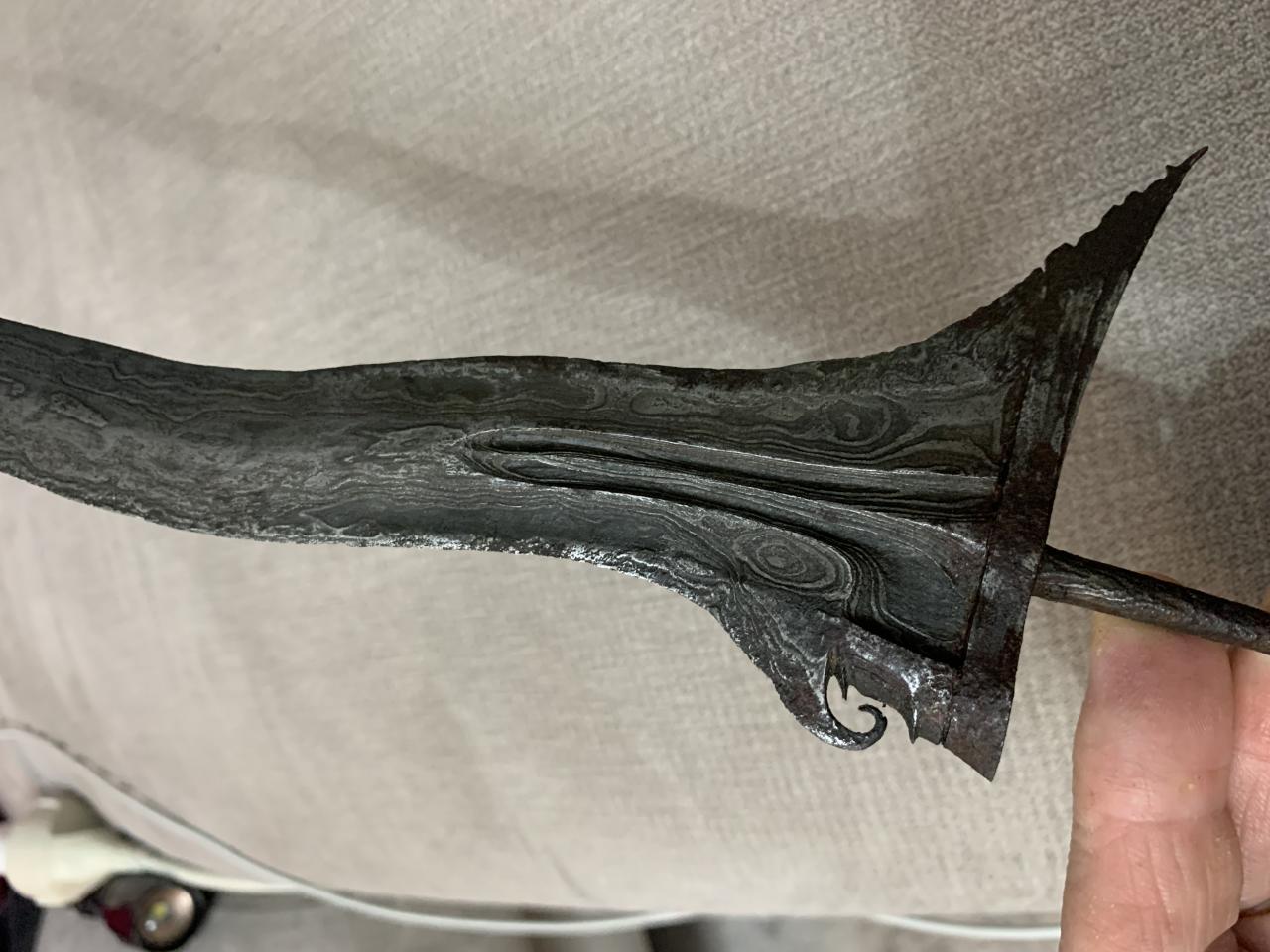 A little rusty, the wood is cracked, the other part of the wood is in the scabbard. Does anyone know anything more ,how old can it be ?