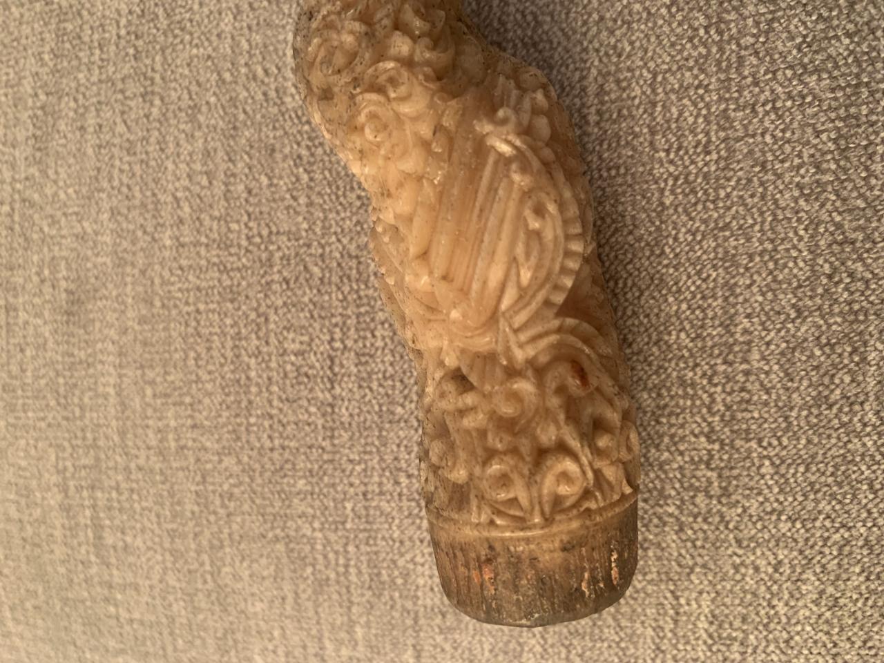 The material appears to be bone, or perhaps de-natured antler, the carving appears to be good middle quality, I'm guessing age at around 1900, certainly pre-WWII.