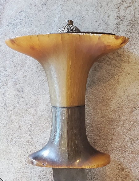 Shotel: Gurade: And of course the Afar gile/jile: That's my understanding of it anyway, but others may know more. With respect to the hilt materials, while I have not been able to confirm this, I've read at least one source that claimed the light colored, yellowish hilts were made of giraffe hoof, whereas the darker horn may be either rhino or bovine. But then again, buffalo/cow horn comes in different shades so perhaps the giraffe hoof is just a bit of fanciful advertising. Both pieces of your grip look like horn to me, rather than wood. |