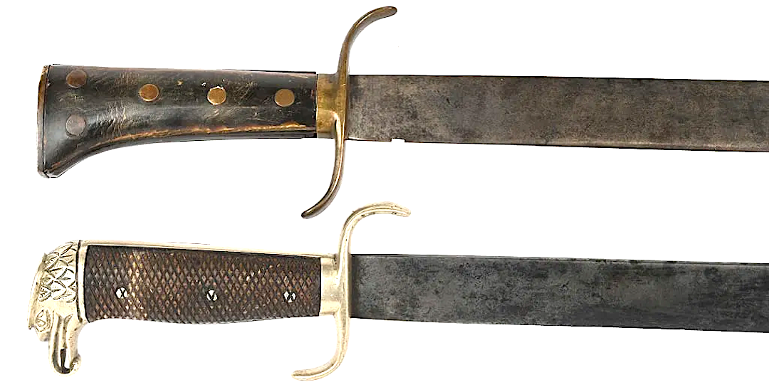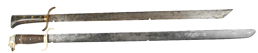 The top one is from the late 19th C and is marked "Fernando Esser Elberfeld Warranted Machete No. 87." Total length = 30.25 inches, with a 25 inch blade that shows graying. The horn handle is excellent. This sword was issued to officers. The second one is marked "Collins & Co. Machete No. 87" on the blade. Overall length = 32.5 inches; blade length = 27 inches. This machete sword was made as a copy of the Fernando Esser sword, and hence had the same model number. It was probably made in the first few years of the 20th C. Comments welcome. . |