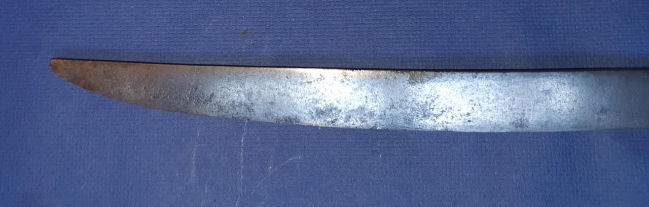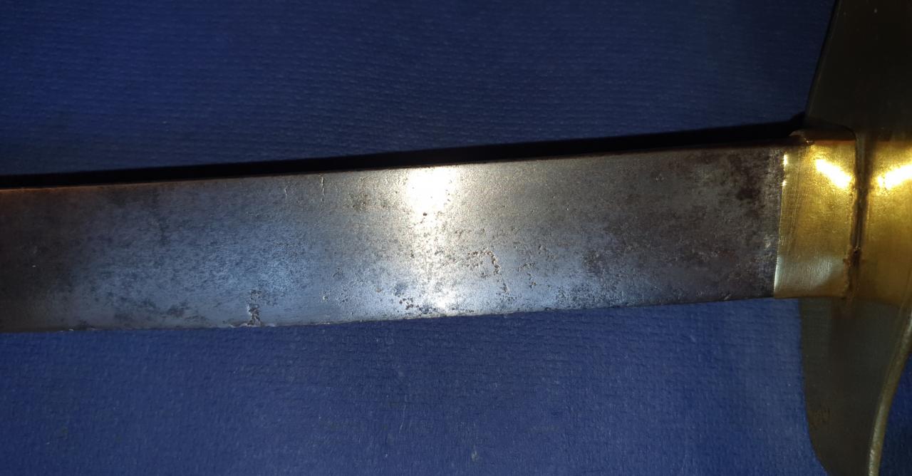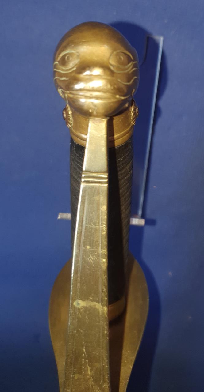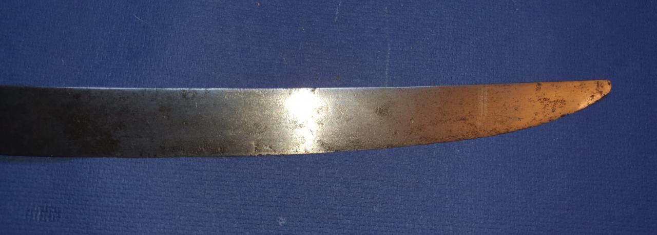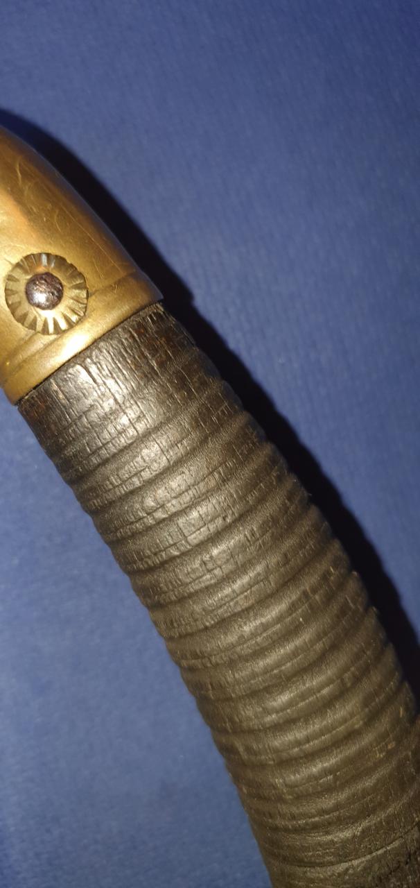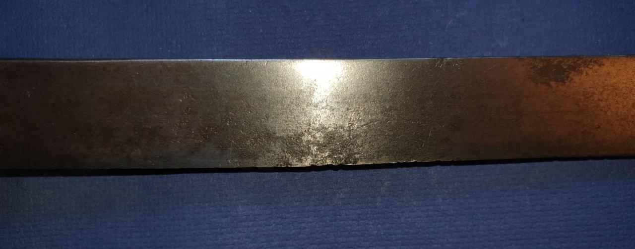 I offer this very nice (in my humble opinion) Vietnamese guom for sale. The fittings are from brass, the handle is from some sort of horn, it's very dark in colour but I can't say exactly which horn it could be. The blade is free from rust but there is some minor pitting to it. It could be that the tip was once bent but its very straight now in it's actual condition, see pics. A very nice sword which was meant for use and not one of these parade guoms which have been for show/dress. No scabbard. 79 cm long, blade alone is 64,5 cm long and 6 mm thick at the spine directly behind the "habaki", 556 gram.