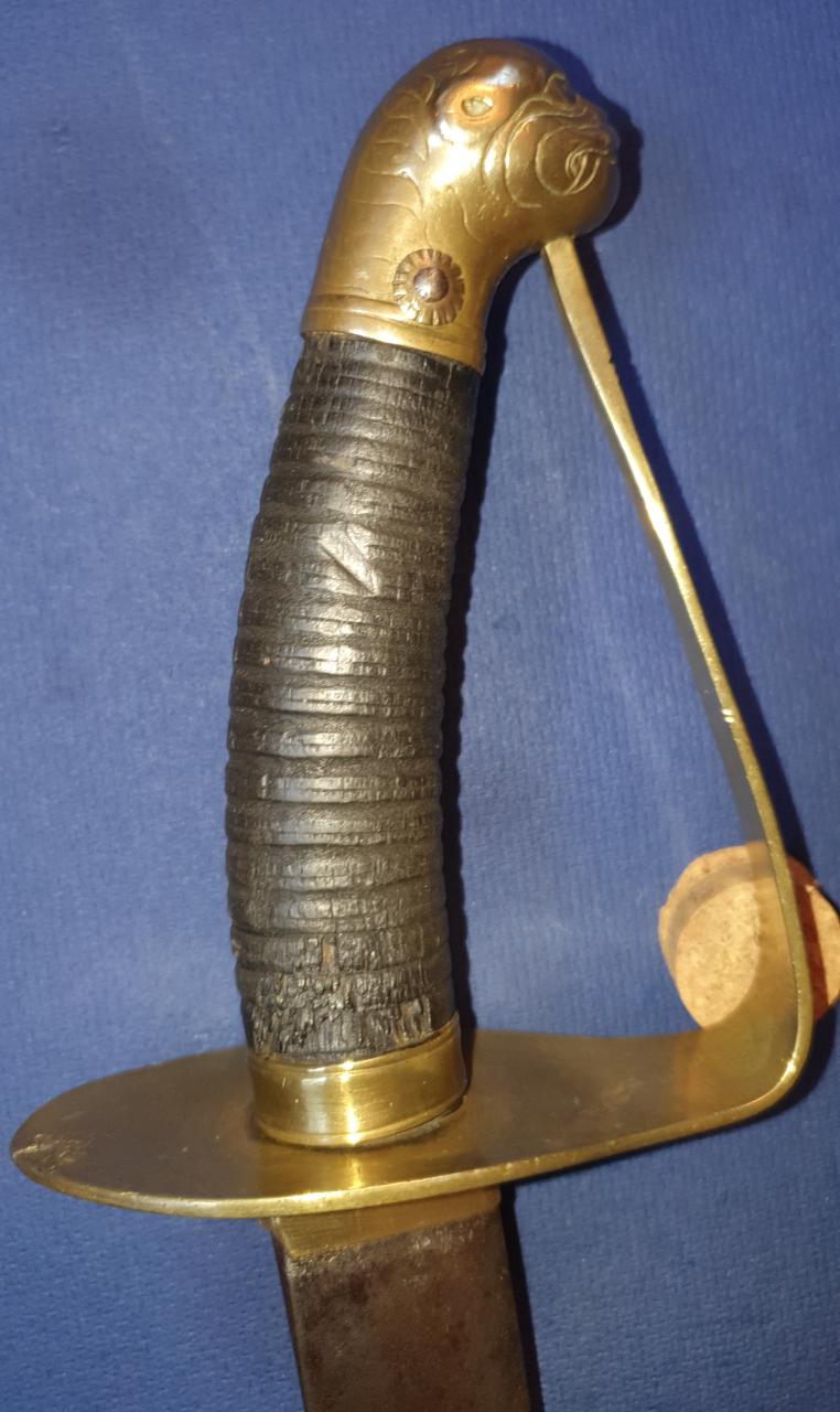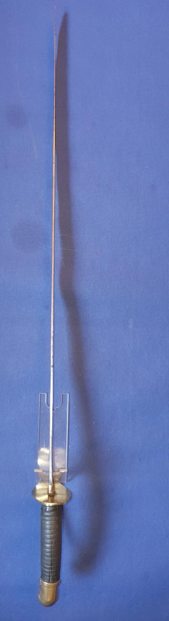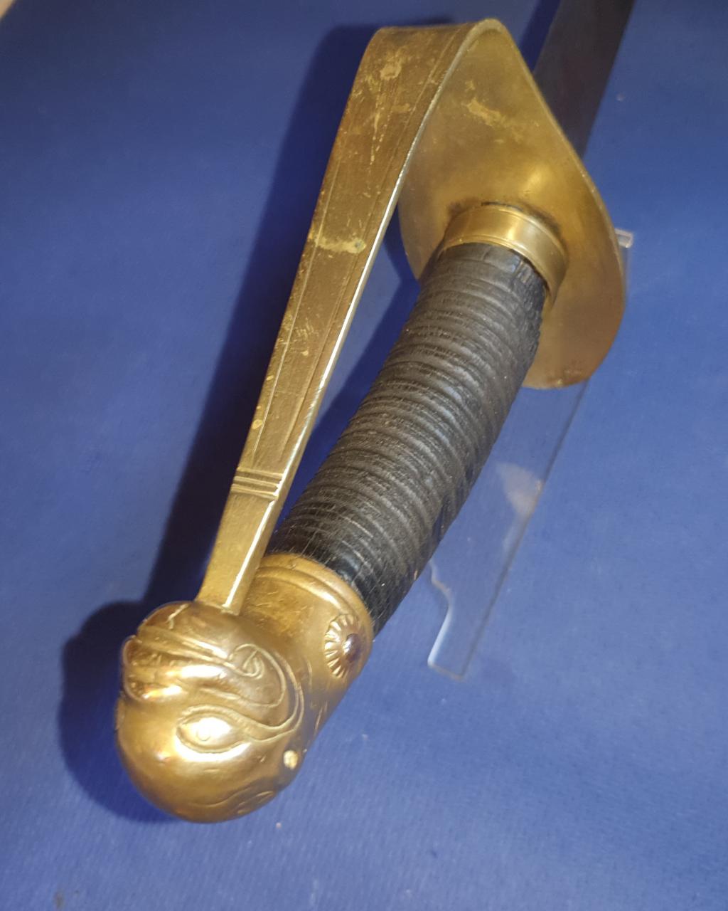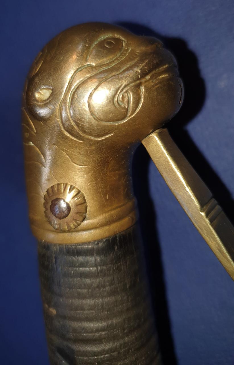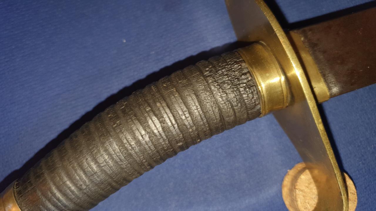 I offer this very nice (in my humble opinion) Vietnamese guom for sale. The fittings are from brass, the handle is from some sort of horn, it's very dark in colour but I can't say exactly which horn it could be. The blade is free from rust but there is some minor pitting to it. It could be that the tip was once bent but its very straight now in it's actual condition, see pics. A very nice sword which was meant for use and not one of these parade guoms which have been for show/dress. No scabbard. 79 cm long, blade alone is 64,5 cm long and 6 mm thick at the spine directly behind the "habaki", 556 gram.