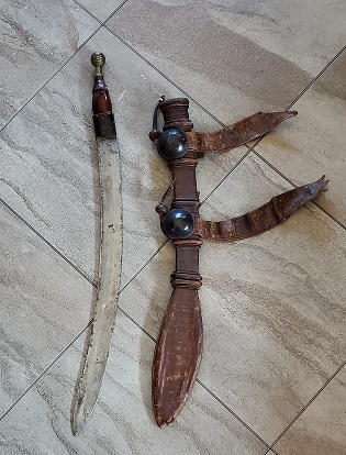 So using the occurrence of such features on other 'Mande' associated weapons with similar features, actually which are bulbous rather than flared, the question is what do these represent, as well as decorative character. The potential for snake related potential is brought up. By analogy, in India there are the swords with disc like features which are termed by collectors, 'cobra swords' referring to the flared hood of the cobra snake. These seem to be primarily situated in Uttar Pradesh in Northern India with the Pahari people and also connected to Hindu Rajputs. The chakra (=disc, wheel) is a weapon of Shiva, which is what this feature actually represents, not a cobra or snake. The disc appears typically at the root of the blade, however there are examples of Hindu basket hilt with the disc at distal end of blade, with a serrated (nagan) blade. These are the kinds of situations we end up with in trying to determine what sort of symbolism is being represented and hoping to apply that to the determining regions the feature commonality might denote. Again, while off the course of the subject weapons, just an illustration of the situation. |
