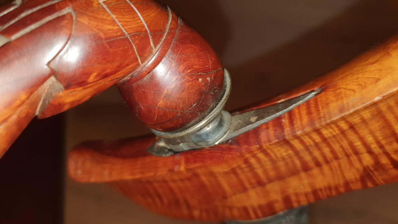 I have already opened the sheath throat slightly to seat the blade so it no longer wobbles. As I thought it would, the aring side now fits very well so I have decided to carve a piece of wood to fill the gap on the dagu side. Your examples show me what to shoot for. Cutting the wood to fit isn’t really the problem. Color and figure (aka grain) matching the existing wood is where it gets dicey. Once the type of wood is selected, various staining methods can be tried out on scraps of the same wood. This narrows the odds a bit because you really only have one shot to get it right after the piece is cut to fit. It will take a while to get this project done but I’ll post the results when I finish.