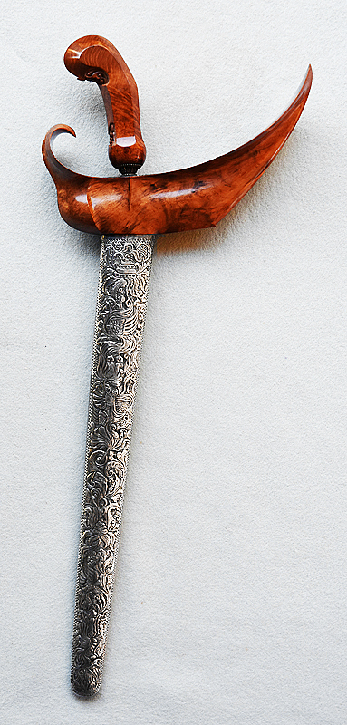 My wife gave me this very nice 3 luk Bugis keris with its very well carved, ivory Java demam hilt and silver selut for my birthday. I have four questions about the sheath which appears to be fairly recent. I know that I will need to make a small modification to the throat in order for the blade to seat properly but the size of the wranka appears to be proportionate to the hilt.