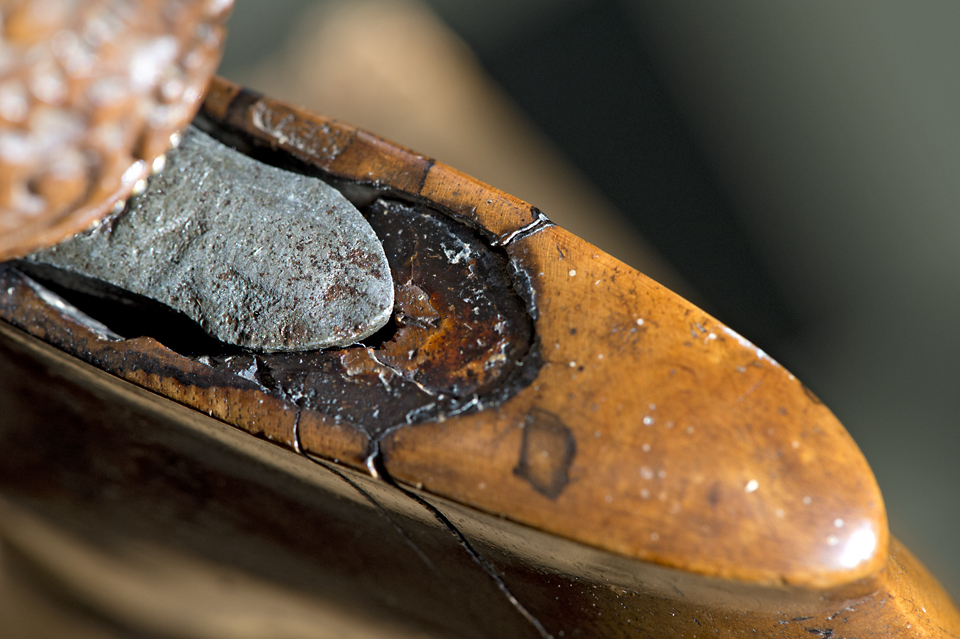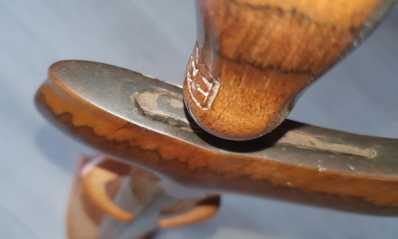 The buntut has been covered with a rather opaque stain. I have examined the chip with a magnifying glass and it appears for all the world to be some sort of poplar. The bottom of the buntut (where the stain is less opaque) shows a figure like poplar also. Ideally, I would like to fit a wood piece to fill the chip but that looks like it might be tough to do. I’ll give it a shot but, if I fail, plastic wood will work.