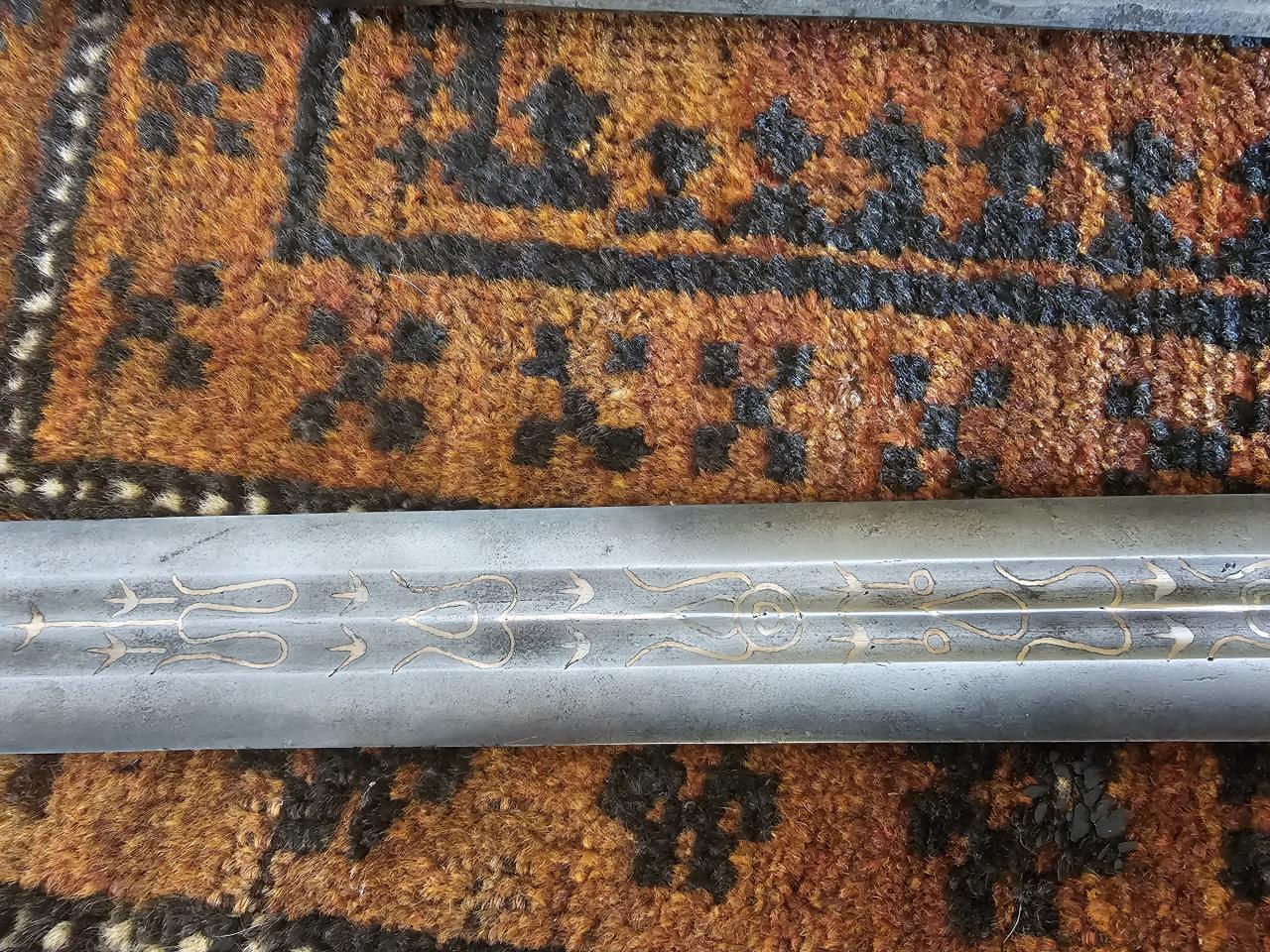 I have seen a few of these now. I was pleased to score it on Ebay for a very reasonable price. Quality is very evident in both blade and fittings. Some of the blade inlay has a rose tint while other areas are more silver. Was it common to combine suasa and silver inlay? The seperate ganja and design details point to late 19C from what I understand. I have seen a number of similar builds online. The band at.base of of pommel/hilt is thick plated suasa over what appears to be bronze. I believe the othe bands are fully suasa and the woven bands, ferrule and pommel are clearly silver but I.do not know quality. The arch-like inlays at base of blade and spur/arrow like inlay symbols are also seen on other examples