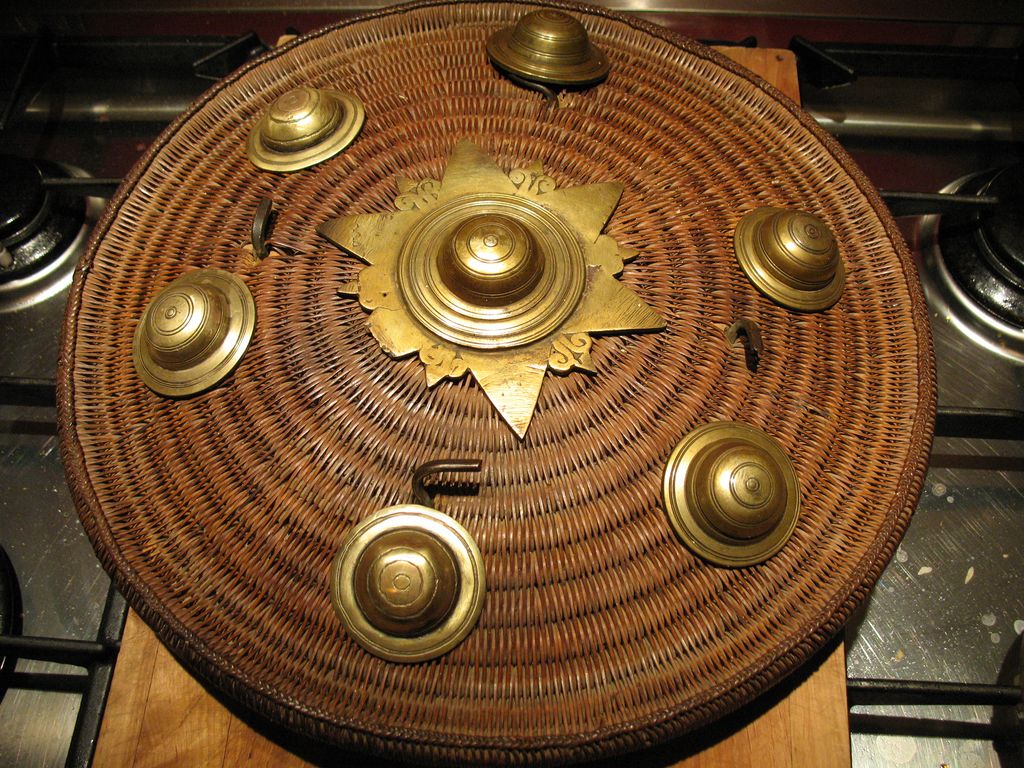 This example has 2 rare metal pieces being roughly fixed for carrying it on the arm. Similar arm straps can be found on shields in the collection of RMV. 2 of the small round circles are different / of later date. |