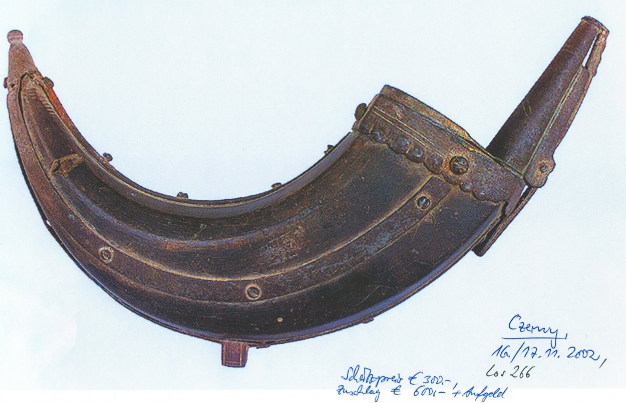 This is the oldest known large powder horn (29 cm) that ever occurred to me, ca. 1540-60.