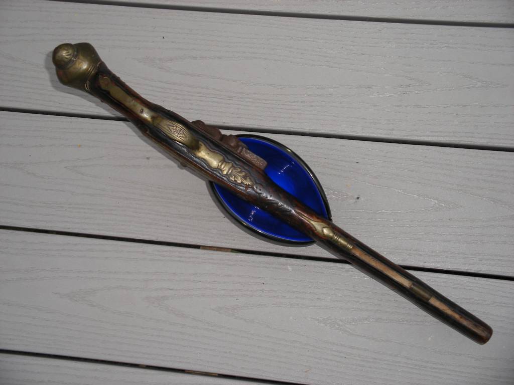 1) OK. False ramrod. More evidence of being locally made/assembled. The lock also looks locally made. 2) Unfortunately, "markings" are not one of my strong suites. But it does look like the numeral 4 from the photos, and does look like a stamp. But the proposed broad arrow doesn't appear to be a stamp (?). Looks more like a cut or engraving. The same with the two straight marks just ahead of the arrow. I've never seen one of these pistols with an English proof. Unless Afghan made. Seen Belgium, Italian, and even one German marked barrel, and of course locally made barrels. But not English. Or at least any proofs. The other stamp, that looks locally done, I have no idea. 3) The barrels, locks, and some hardware were both locally made and imported. There were even complete guns, European made, and decorated for local tastes, and exported for re-sale. That's also why these pistols are often mis-identified as Italian, Dutch, or something else. So the combination/mix of parts all over the map you might say. LOL 4) Most of these pistols had one or more barrel bands. Your's may have had a single barrel band at the muzzle end with a groove on the lower part to accomodate the rod. But check the bottom of the barrel for any evidence that there may have been one or two underlugs that would have been soldered to the barrel, or a small square, shallow cut in the barrel to accomodate one or more pins. In other words, the barrel may have originally been pin fastend, but the underlugs that held the pins are now gone. Is there one or more small holes in the stock where a barrel pin(s) might have once been? Rick. |