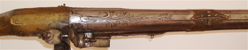 What a beautiful - and interesting pistol. At first glance, the overall proportions of the gun look just like a typical Ottoman/Balkan made kubur pistol. The lock style, butt cap, trigger guard, etc. But Kubur, above, is probably correct. The last time I saw the facial impression on the breech of a barrel was on a Greek/Rasak long gun. The Greeks were also fond of making their triggers in the form of humans. Most of the relief chiseling on the barrels that I've seen were on Ottomah/Balkan guns, but done in a more generic matter such as the barrel on the Ottoman Knee Pistol below. If you have a chance, would you run a piece of wire or something down the ramrod channel and see if the hole goes all the way back towards the breech? Or does the wire travel only a couple inches past the lowere ramrod thimble? It would be interesting to know since it looks like it was made for a full length ramrod vs a false ramrod. Thanks. Rick. |