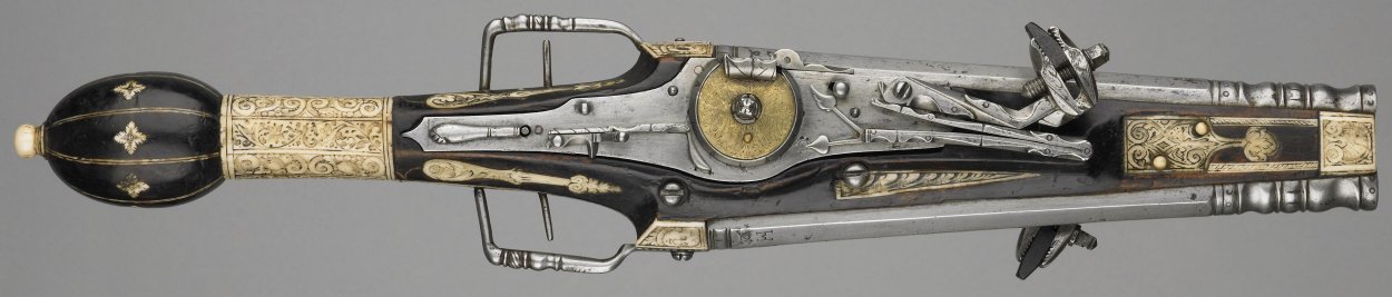 Here is a long Nuremberg-style Alsatian double wheellock wender pistol of about 1610; the lemon-shaped butt of such a type of pistol was used to crudely transform the Wallace pistol dated 1554 (A1135).