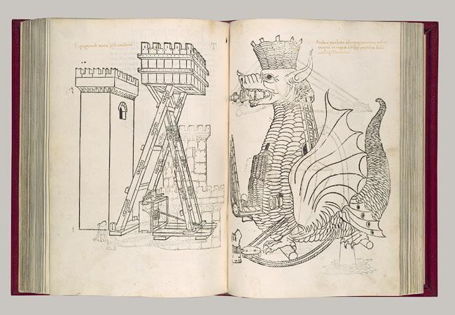 Many thanks to all of you for your esteemed contributions which have added various new impulses to my understanding! As to the historical person of Flavius Vegetius Renatus: He was a Roman military theoretic, who lived around 400 a.D. Like all ancient Roman and Greek cultural motifs, the Italian and German Renaissance (nomen est omen!) of the 16th century took up the ancient military devices again, copied and modified them to meet contemporary technical standards and needs. Thus, the anonymous author of these Renaissance technical and military books assumed the name of the ancient Roman author, indicating at the same time his will to continue and update the work of his predecessor. As early as 1466, another early Renaissance author named Roberto Valturio published modernized copies of the original Roman author's works illustrated by colored contemporary woodcuts. I attach a few of them and you will see that Valturio and F.V. Renatus were kindred minds. What was actually new to the Renaissance re-born works was their profuse illustration with woodcuts made by contemporary artisans. As has been observed in replies to this post, the author of a Gothic or Renaissance book was never identical with the illustrator(s). Thanks again, all of you are brilliant and discussions like this are an important enrichment to our forum! Best, Michael |