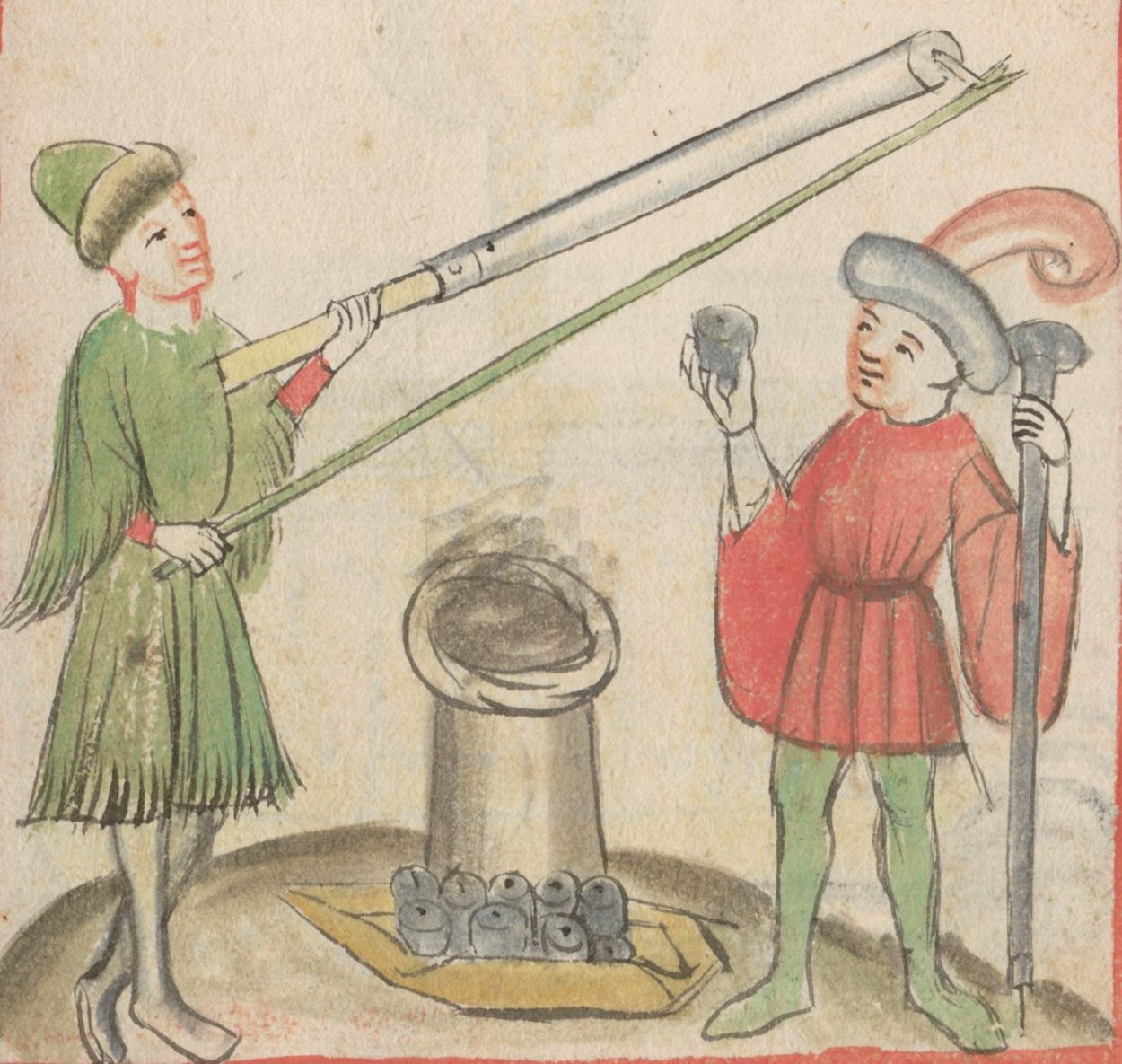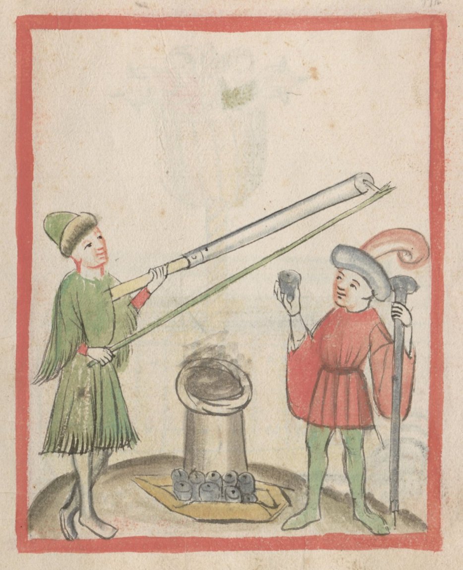 Then the barrel was ignited from the muzzle (!) either by a clamp holding a smoldering length of matchcord or by a red hot iron - see original illustrations of 1411! - , and all shots were fired in rapid succession ...