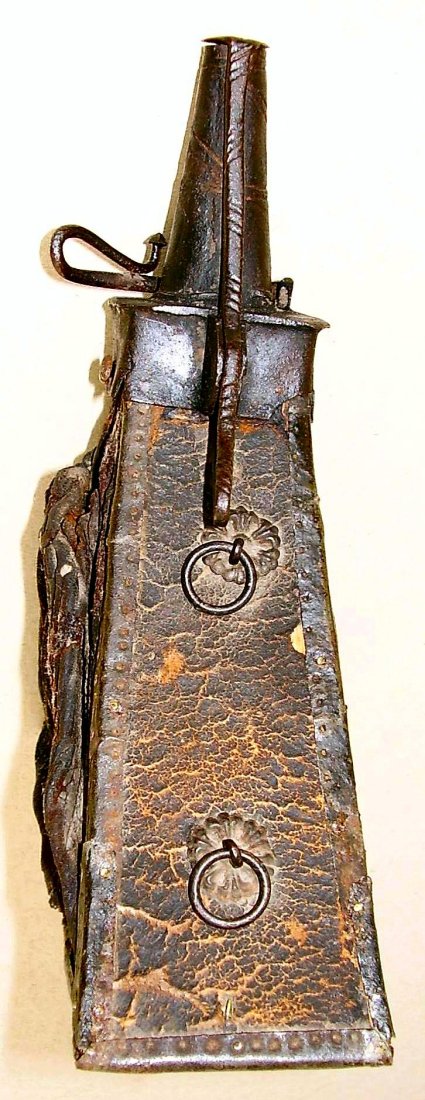 Here is another very early trapezoid flask, North Italian, ca. 1520-40, with a characteristically Italian dosing device (a horizontal cutoff) to the nozzle, a stage of development that is missing on the Basel flasks, the leather tooled in the Italian manner, and both sides completely straight, with no curving.