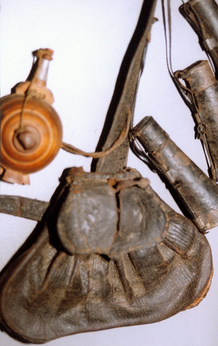 The left one of the small flasks was for priming powder, ca. 1570-80, the other with the additional leather pouch belonged to the pistols and arquebuses of Saxon guardsmen of ca. 1560. The pouch was v´certainly not for balls but probably for reserve pyrites or small cleaning tools such as worms and scourers.