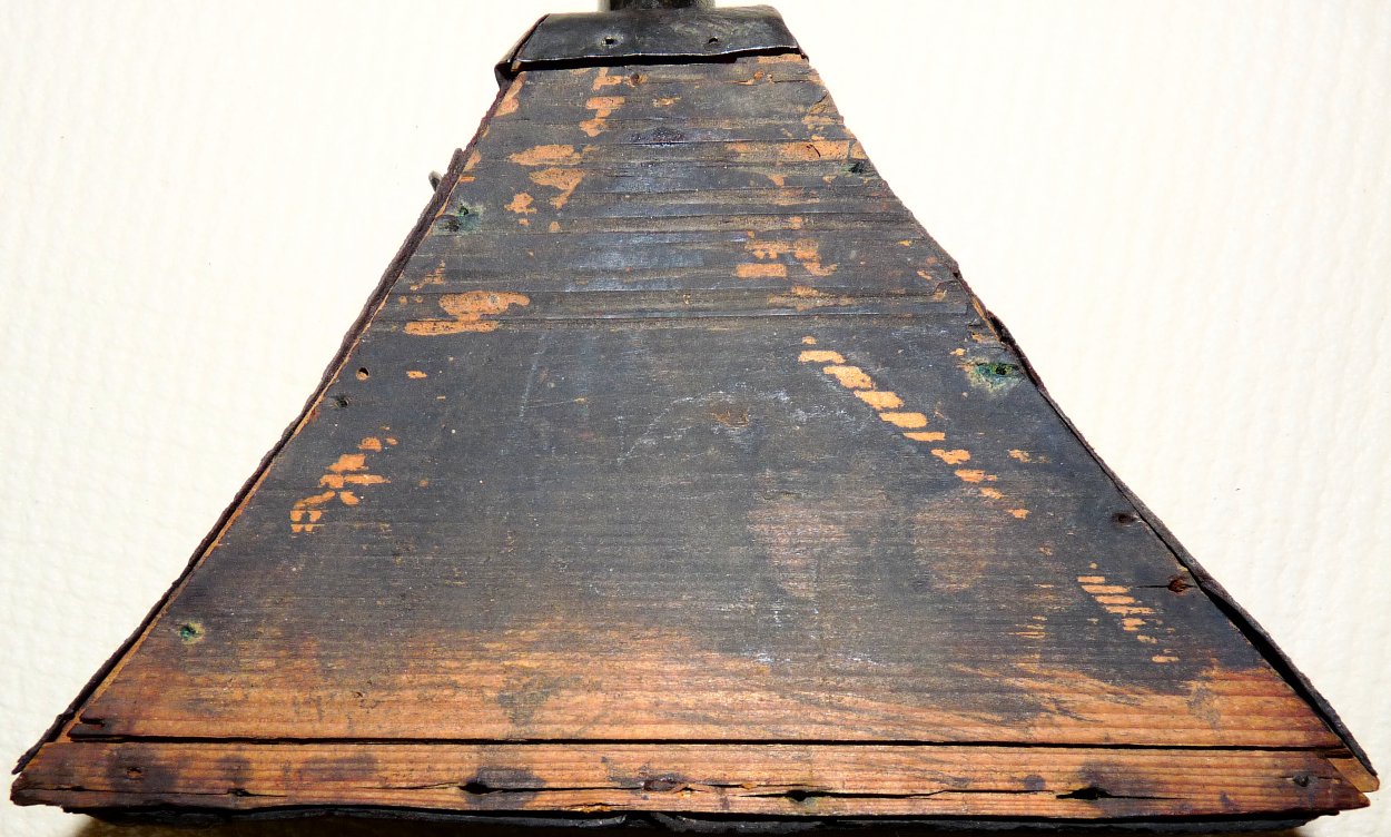 Bottom attachment: this the shape of a typical High Gothic quiver for quarrels/crossbow bolts; its basic form with the straight sides - and the later, concavely curved types - strongly influenced the earliest trapezoid powder flasks and, for the complete short span of time of their production, which was only from ca. 1550-1590, the rare patrons for paper cartridges: