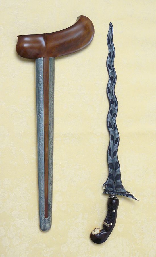 At first glance, the smaller kriss looks to be the same, but though the patterns are similar, that one is missing the fine nickel lines. That kriss may very well be in its original polish; I doubt the larger one is. These are both great examples of complex forging on lovely..and deadly...Moro blades. The forgers were quite skilled. I am hoping one of our specialists in the art of blade forging can explain exactly how this pattern was created. It almost looks as if the entire blade is forged in a twistcore pattern. |