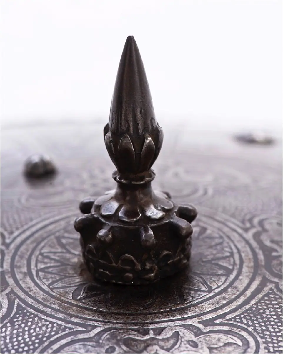 A rondal spike in the middle with a spiral motive running from top to bottom, with leaves at the base. Spiraling pattern shield with a reinforced rim. All lovely words, but to be honest i have no deeper clue as to its origin or style. Any help is once again appreciated. It would also be most helpful to get good source material on original handle or leather straps that used to be on the inside. I did find some examples but would be very interested to know how these would generally have looked like. And maybe, if it will prove not to intrusive i might get it restored so that it can be mounted with a complete armour. But that is a story for another time and a work in progress