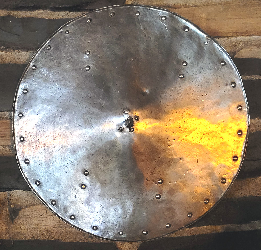 I'll add my own solitary shield of this sort - strictly munitions grade - really heavy and with what the seller described as a bullet-made test dent. 56 cm. diameter; 3.5 cm spike. |