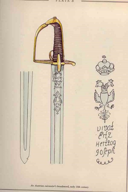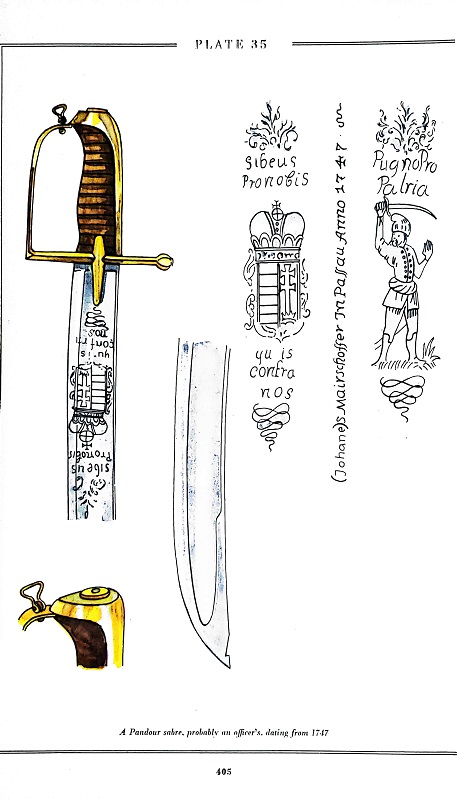 Virtually nobody had given this strange feature a second thought, many seeming to wonder what such an insignificant feature or practice mattered, often just throwing out flip responses. Actually Wagner, the single source who had thought the practice significant enough to include in his detailed line drawings in 1967, was the only one who suggested the possible purpose behind these notches.....to add to the wounding capacity of the 'old hewers' (heavy Austrian pallasches). What puzzled me was, why then would the back of a saber blade be notched? with it being a slashing weapon, so the 'barbed' points effect in thrust etc. ? It is often hard to understand for those insistent on pragmatic solutions for things to grasp practices or vestigial features which are a matter of simple symbolic convention or talismanic device, so the only solutions which were seemingly worthy of consideration were these practical notions. Could you please post that Prussian 1732 example ? Here is my 'pandour' saber, which is I believe Hungarian, but of course Austro-Hungarian (with page from 'Wagner' , 1967). |
