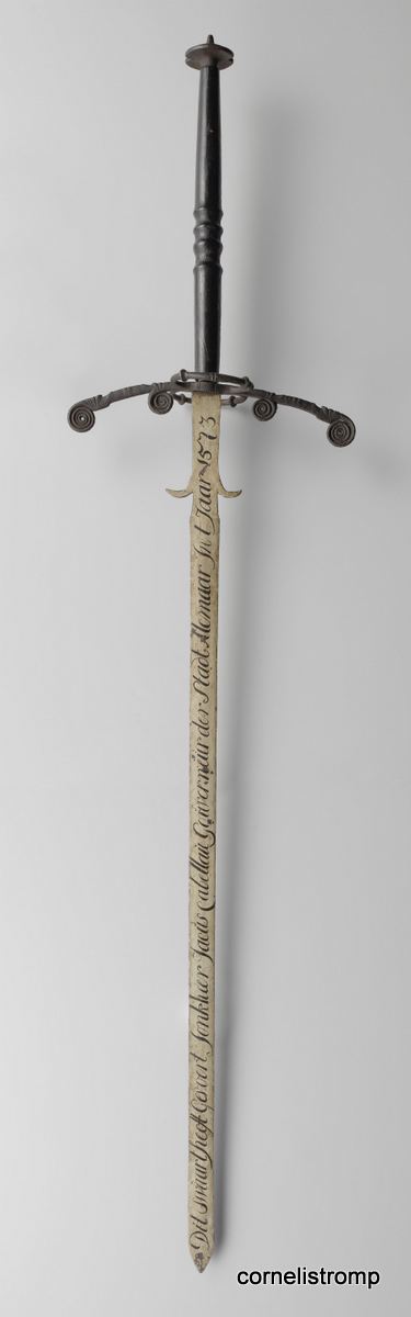 THIS SWORD WAS CARRIED BY JONKHEER JACUS CABELLAU GOVERNOR OF THE TOWN OF ALKMAAR IN THE YEAR 1573.