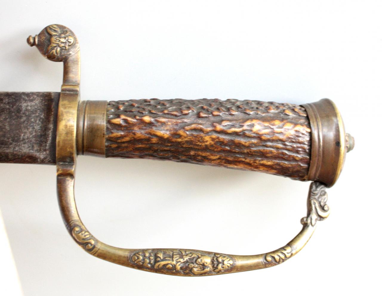 This amazing piece comes from the Lanes Armoury. It's a late 17th century hunting hanger with brass fittings, stag hilt, pierced guard with foliage, German made 21" curved blade with false edge and faint stamp which I suspect is the 'knight's head' for the Wundes family of smiths.