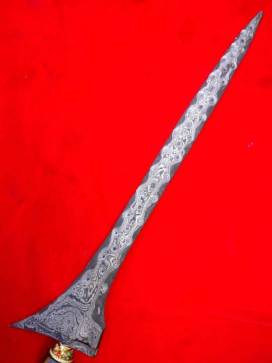 this is my 2nd Keris from Central Java Specification: the character of this Kris: Dapur: Tilam Upih.--> Pamor (blade motive): Udan Mas.--> gold rainfall (this is one of the most favourite pamor) Tangguh: Kamardikan.-->means this is a new made kris (Kamardikan means period 1945-now) Blade: 35 Cm. Scabbard & Handle: Kayu Sono Keling. |