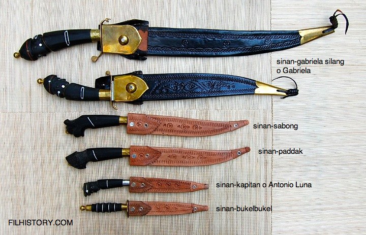 Your question raises a few important points, and I want to take a little space to discuss Ilocano knives and their description by that ethnic group, and also make a few comments about Pampangan knives. First, why are the knives that are shown here Ilocano? In a very helpful post on this site in 2010, migueldiaz provided some key information and an important reference about Ilocano knives (see here). In that thread he posted the following pictures and descriptions of Ilocano knives (the examples were modern made knives but come from a long tradition of similar knives). Apparently, the Ilocano nomenclature he provides was based largely on the hilt style, and he provides the names for a dozen different styles. Here are the Ilocano terms for those styles: kinakandon: a blade which form was inspired by the palay (rice plant) leaf => am still getting a photo of this blade [Comment: this blade style is called dahong palay and is discussed elsewhere on this site along with pictures of examples with this blade style--see here, here, and here]And here is his picture illustrating some of these types of knives: http://www.vikingsword.com/vb/attach...id=60025&stc=1 If you look at the examples of tabak knives shown here, you will see that each has a hilt that fits with the descriptions provided by migueldiaz. Of particular interest is the first example I showed in the original post of this thread. It would be called a sinan-kapitan, and as far as I know this particular depiction of an officer wearing a cap is uniquely Ilocano. The second example I showed would be called a sinan-sabong. Your example, shown in the thread that you linked, shows a spirally wired hilt, and might be what migueldiaz describes as a linipit. This collective evidence argues, I think persuasively, that the tabak knife is mainly an Ilocano weapon/tool. Whether it is also produced by Pampangans is not clear, and we actually know very little about the knives of Pampangas. Apart from the knives marked as coming from Apalit, I have found relatively little information about the knives of Pampangas. To some extent the identification of knives specific to the Pampangans has been complicated by the presence of the U.S. Clark AFB in the Province. In threads elsewhere on this site, we have seen that Ilocano knives were marketed extensively to U.S. servicemen from the mid-1940s until the base closed in 1991 following the eruption of Mt. Pinatubo. The base was only three miles from the city of Angeles that sits on the main north-south highway in Central Luzon. It is only 30 miles along this highway from Angeles to the Province of Pangasinan, which has a large population of Ilocanos. It would be a short trip to bring knives from Pangasinan to Angeles for sale to the Americanos. It is also possible that Ilocanos took up residence in Angeles and made knives there. This raises an important consideration in how we reference knives like these. Do we attribute them to the culture of origin or the place where they were acquired? If we choose the culture of origin, then the tabak appears to be an Ilocano weapon/tool. If we reference these to where they were likely purchased or otherwise acquired, then they could be considered Pampangan. Hope this is helpful. Ian. ----------------Attachment---------------- Here is the picture from the thread of migueldiaz showing various Ilocano knives and their distinguishing hilt shapes. . Last edited by Ian; 9th April 2017 at 01:00 AM. Reason: Added pic and some more comments, links |