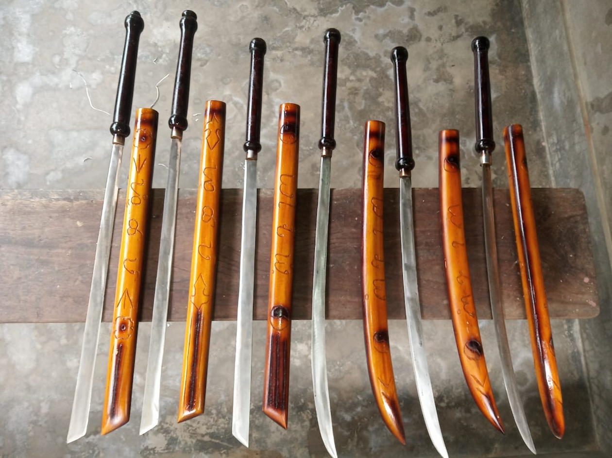 Detlef, I owe you an apology. Here are pictures from an Assam Facebook discussion page showing recently made heng dang. Wooden hilts, including black shiny ones, and a couple with small disc guards! Also, some with tunkou it seems!