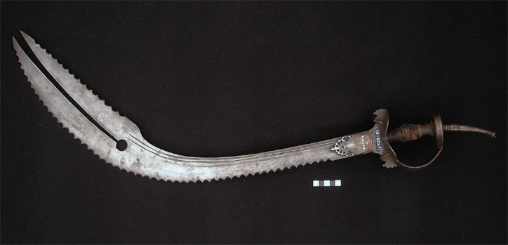 2. The garo milam (link, picture 7). This is another all-metal sword, and it's oddly similar to the Pandit, right down to being held by a cross-piece. Both are pretty distinctive. Why people go in for all-steel blades in the tropics is certainly puzzling.