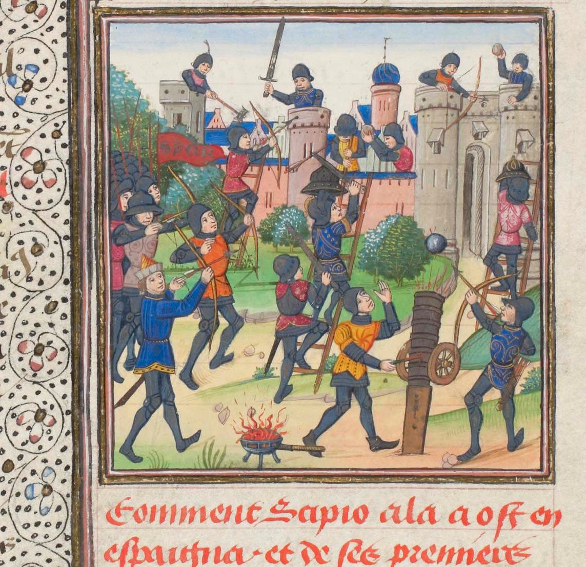 Attached please find the most exact period representation known to me, from Jean Mansel's illuminated Late-Gothic manuscript La fleur des histoires, France, 1453-63, Geneva Library, Ms fr. 64, fol 196r.