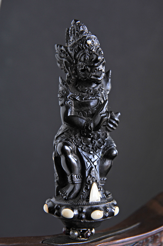Well, no annoyance for me Thor...he makes me smile as well. This hilt is contemporary in manufacture, but i have seen at least one genuinely old version of this character in almost the exact same pose so i'd say it has a traditional basis. Not sure exactly which wayang character this is or if it is just meant to reference the wayang in general.