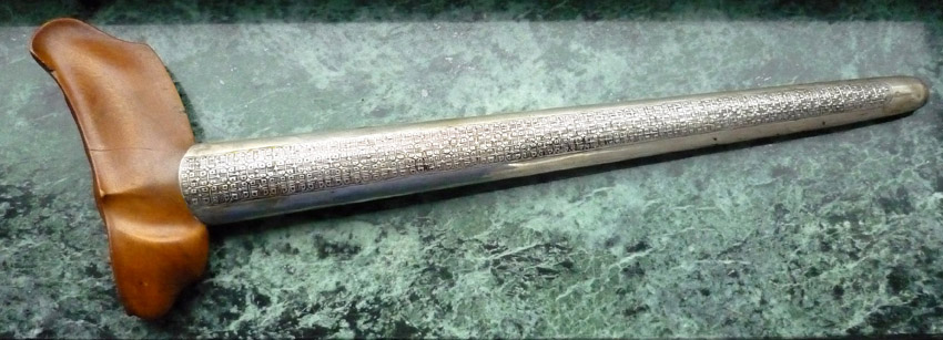 Another unknown sheath with at first glance Djogja features. Purchases without a blade. The warangka looks like derived from a Gayaman ( unfortunantely cracked) but the sides have not been adapted and they show the same patination as all around. The carving (arrow) however is not a Djogja feature. Observing from aside the top level indicates it should carry a blade with ganja wilut. The belonging silver sheath shows a geometrical pattern which I have never seen before ( and slightly longer then a common Djogja pendok, about 1 cm). It is glued together with the crosspiece. What do we see here: an uncommon Djogja or a Pesisir sarong?