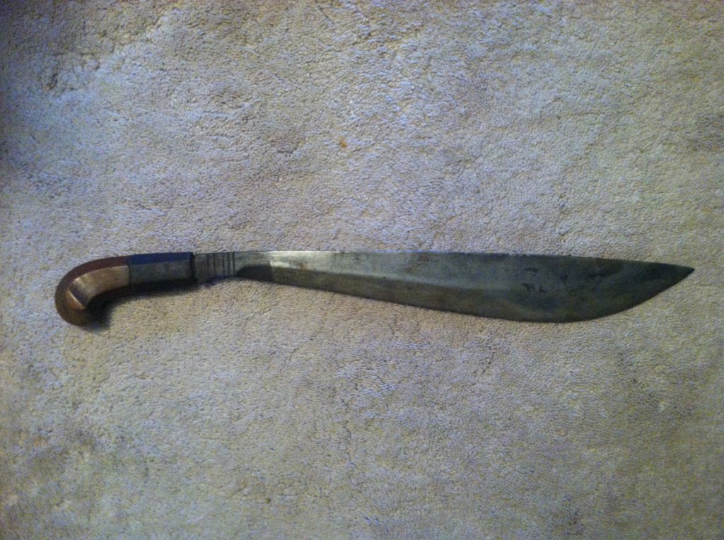 I have been traveling for the last week and just catching up with your post. Detlef is correct -- this sword is from the western Visayas area and would be called either a tenegre or binangon. The blade is somewhat slimmer than most examples. As to age, the scabbard is consistent with the first half of the 20th C, so the early 1900s attribution on the note attached to the hilt might be correct, but I tend to agree with Detlef that it is probably a little later. Ian. |