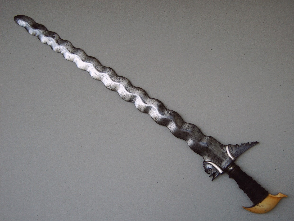Except for some spots of more or less active rust I will leave it as it is. It will look better with the battered handle as it is. No expectations of some special welding miracles, these pieces usually have the most simple construction, like Thilos kris: http://www.vikingsword.com/vb/showth...ighlight=lukky or a kris Stefan sold a while ago: http://www.ashokaarts.com/shop/old-m...o-philippines- Actually very few of these many Luk pieces are upper class, the most notable exception being: http://www.vikingsword.com/vb/showth...guindanao+kris I would be interested in your opinions, why such pieces with an exaggerated number of Luk did appear at all. |