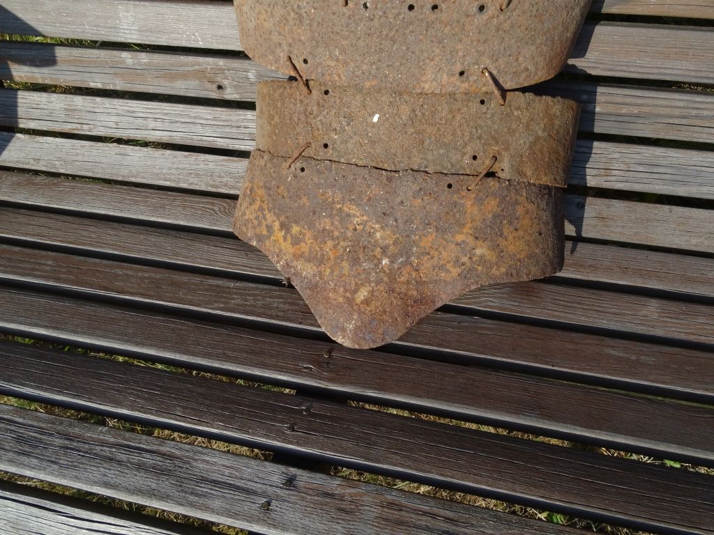 Those metal fasteners are not original - this may have been stacked, perhaps with leather +rivets.